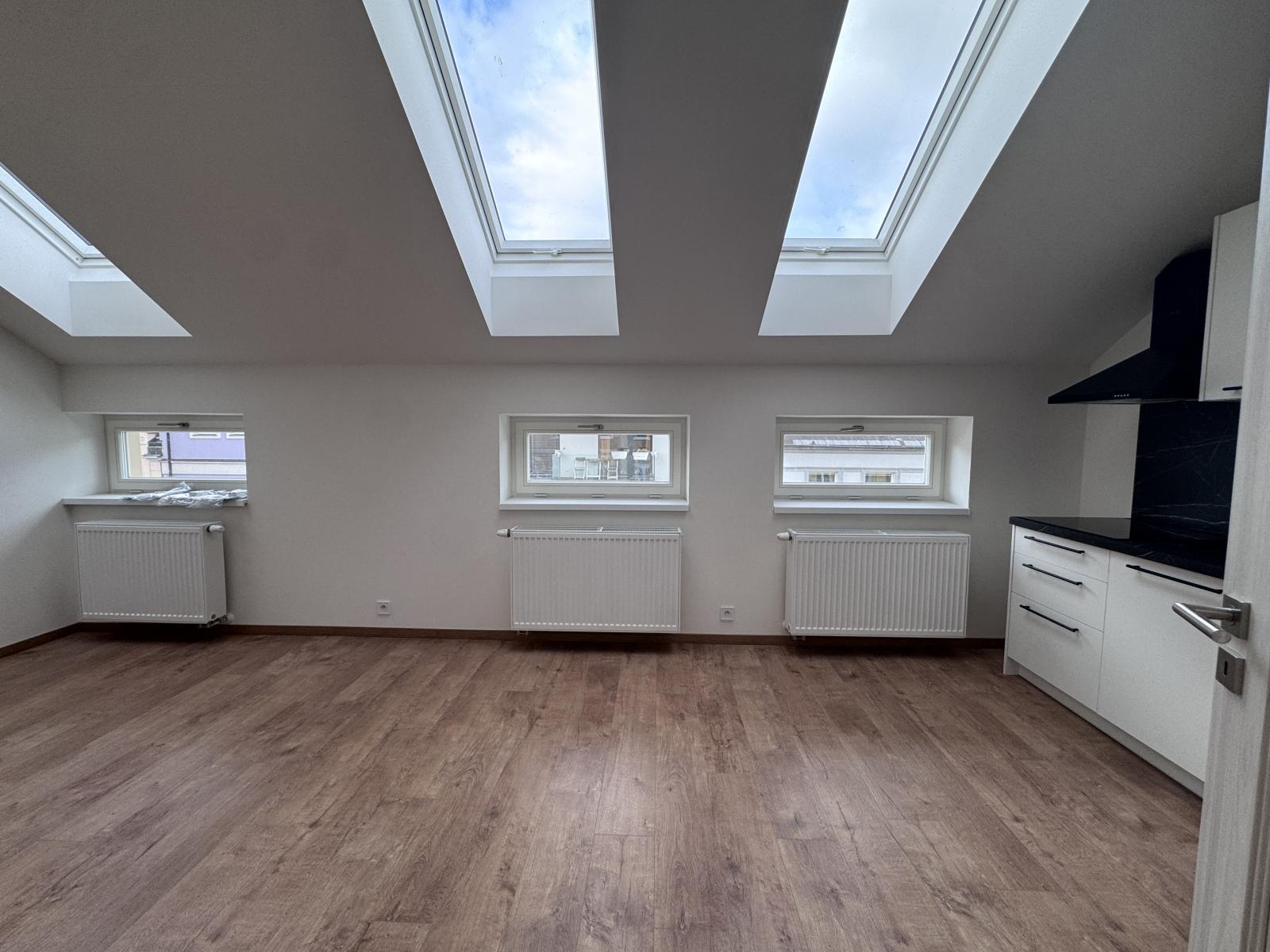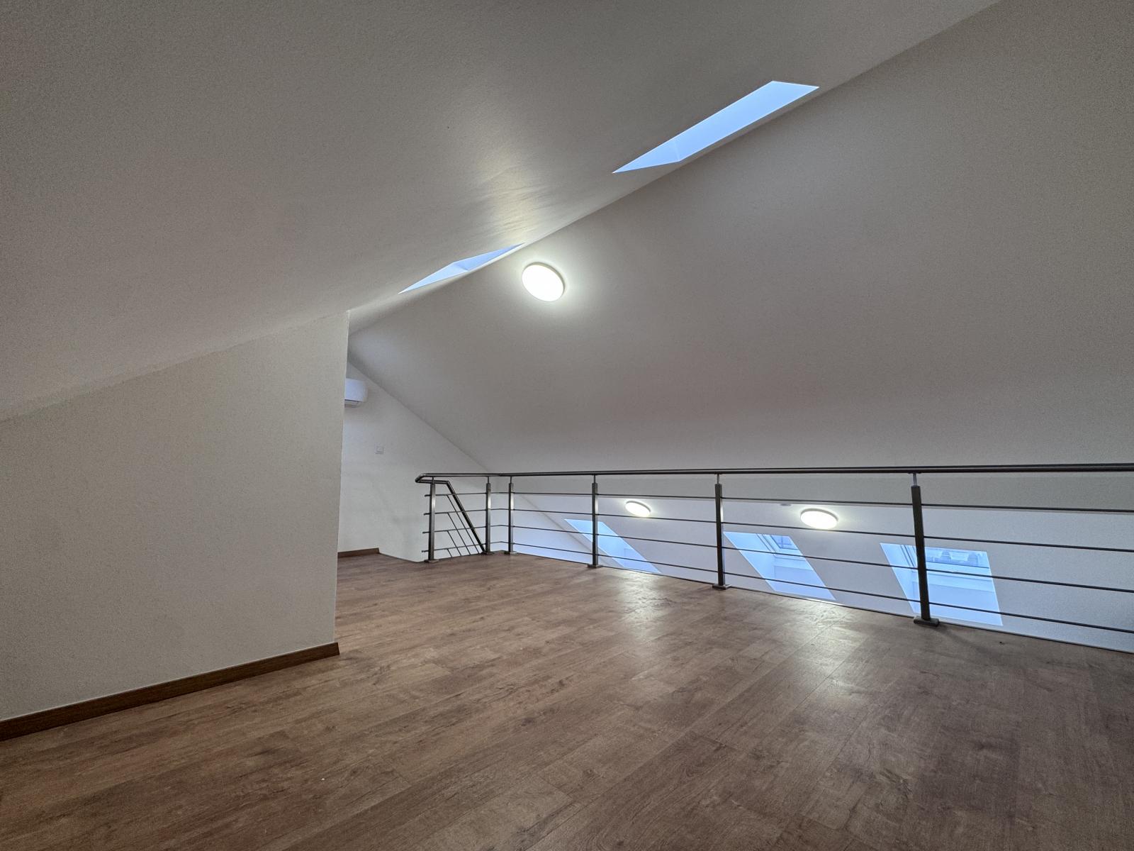 Spodní část bytu má výměru 39 m a disponuje obývacím pokojem s kuchyňským koutem a potřebným zázemím. Horní patro o velikosti cca 20 m tvoří druhou obytnou úroveň, kterou lze využít jako ložnici, pracovnu nebo další pokoj. Mezonetové řešení zajišťuje příjemné oddělení denní a klidové části a dodává bytu vzdušný charakter.