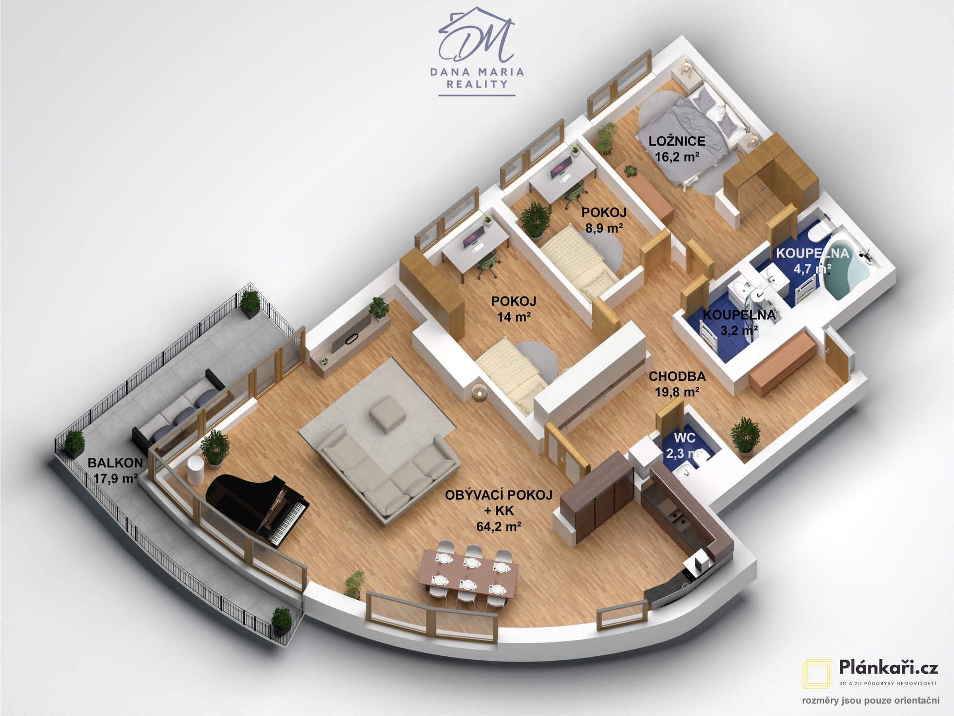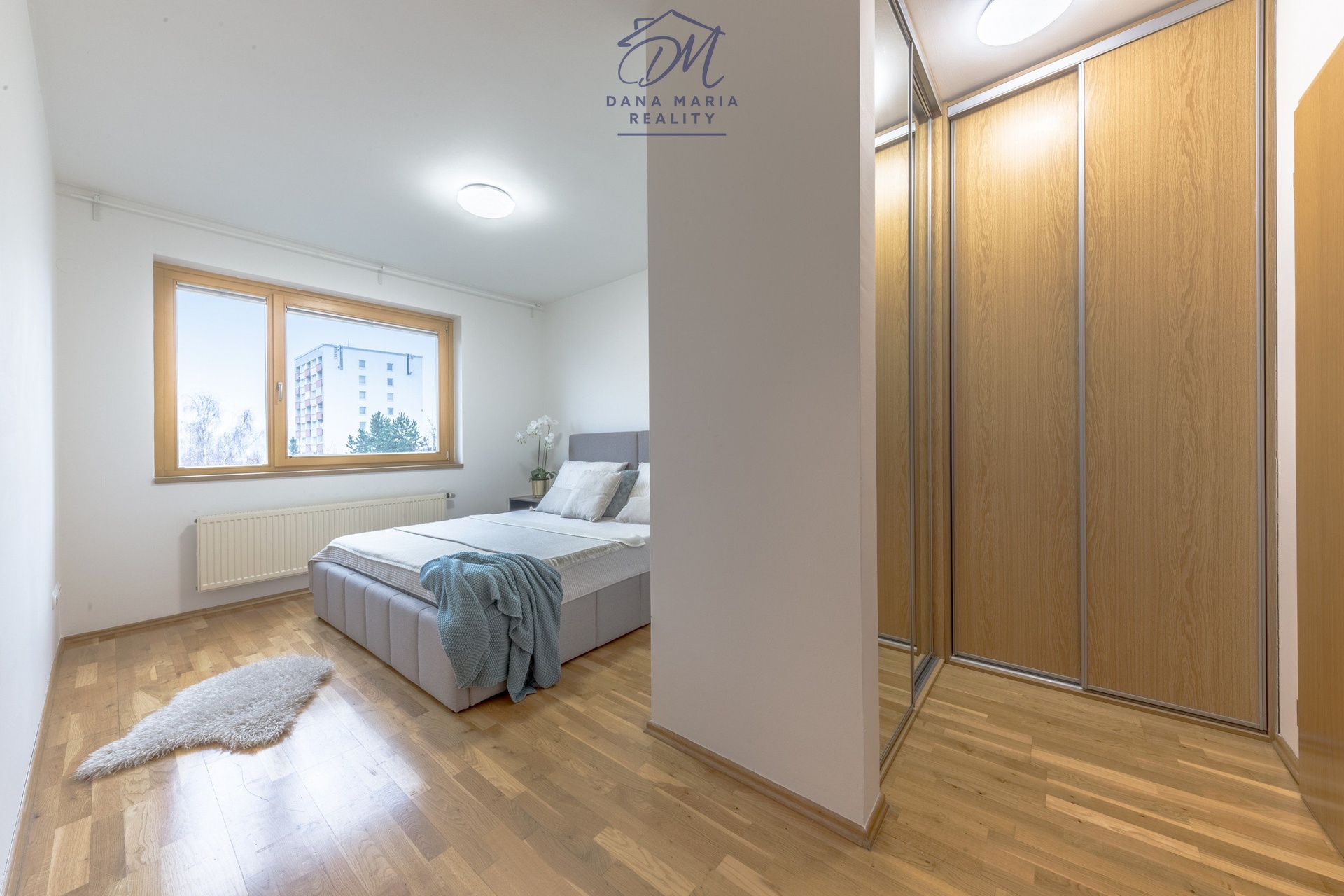 Soukromá část bytu je oddělena a tvoří ji tři samostatné pokoje, které lze využít jako ložnice, dětské pokoje, pracovnu či pokoj pro hosty. Hlavní ložnice disponuje vestavěnou skříní, vlastní koupelnou s vanou a toaletou. K dispozici je dále druhá koupelna se sprchovým koutem, technická místnost s WC, pračkou a sušičkou.