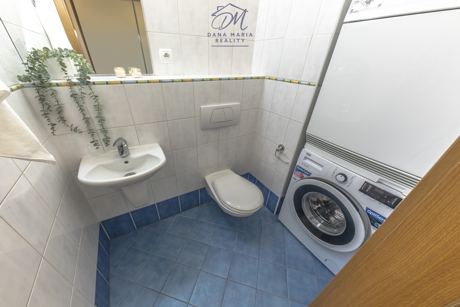Součástí pronájmu je také garážové parkovací stání o nadstandardní velikosti cca 30 m², vhodné i pro větší vůz, a prostorná sklepní kóje.