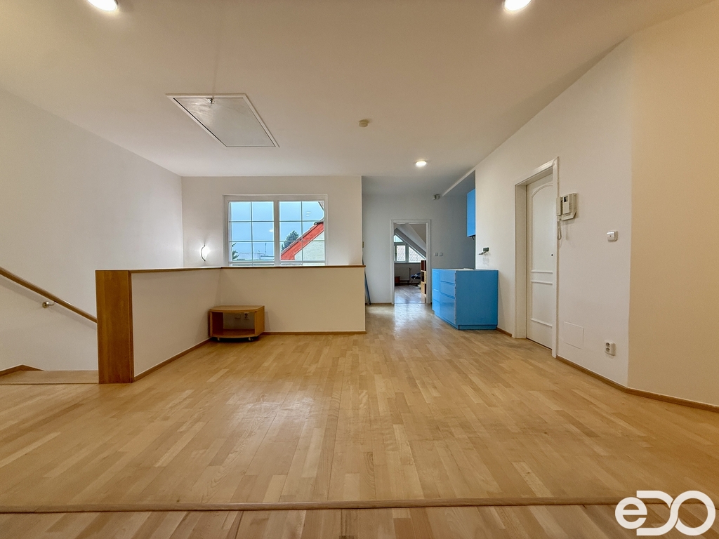 Prostorný podkrovní byt 4+kk v horním patře domu na klidném okraji Prahy, přitom s výbornou dostupností do centra.