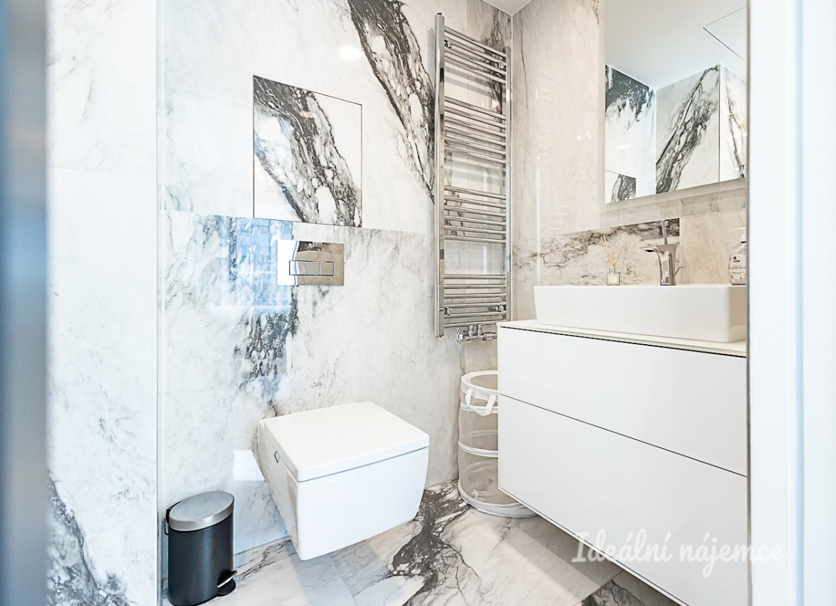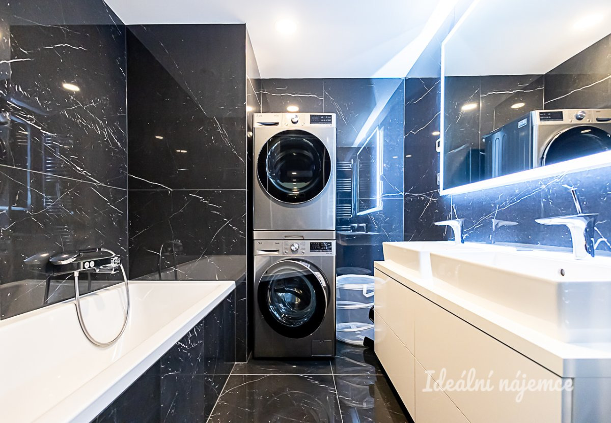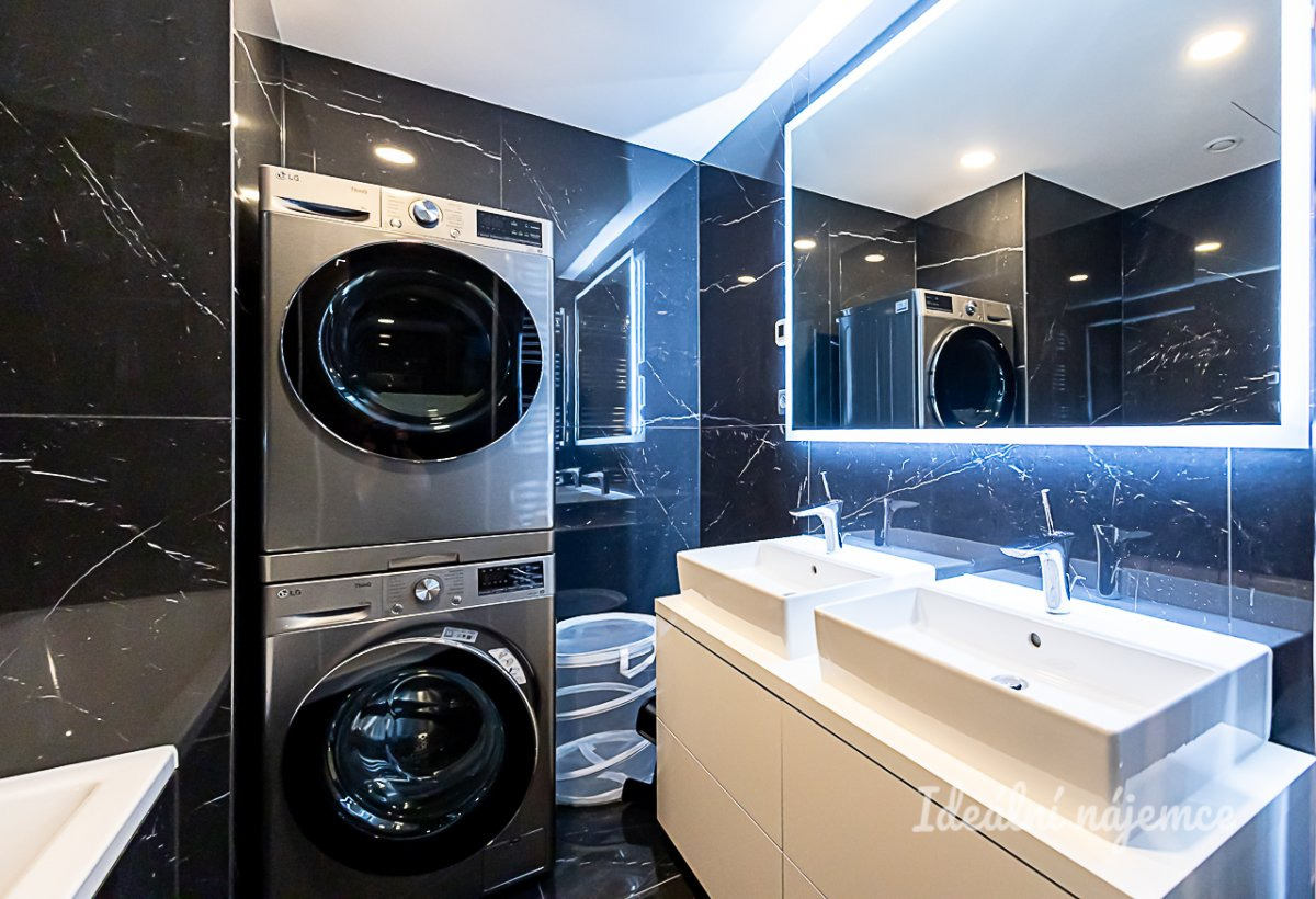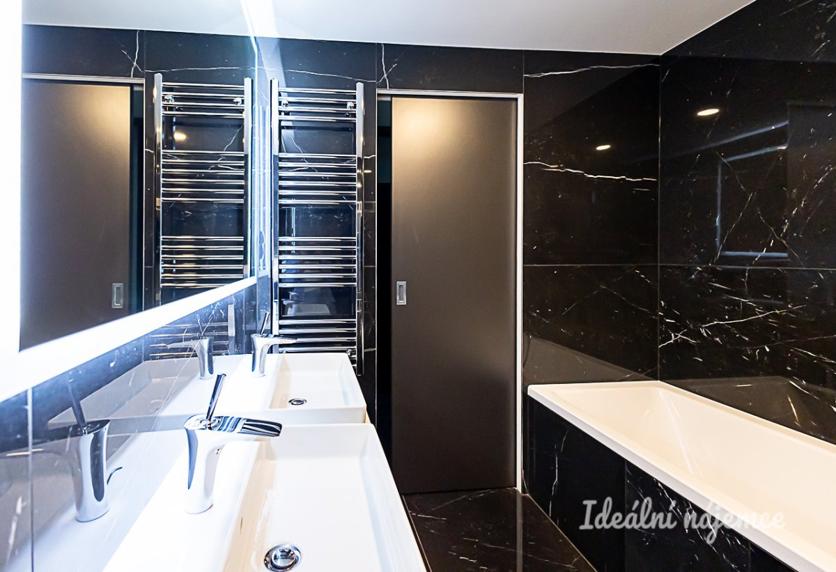 Byt je nabízen plně vybavený a připravený k okamžitému nastěhování. Kuchyně disponuje barovým posezením, lednicí s mrazákem, elektrickou i mikrovlnnou troubou, indukční varnou deskou, digestoří a myčkou. Na kuchyň plynule navazuje obývací pokoj s pohodlnou sedací soupravou, konferenčním stolkem, TV setem a jídelním koutem. V bytě jsou dále dva samostatné pokoje vybavené postelí, vestavěnou skříní a pracovním stolkem se židlí. Dominantou hlavní ložnice je luxusní manželská postel s čelem doplněná o vestavěnou skříň. Hlavní koupelna je zařízena vanou, umyvadlem, koupelnovou skříňkou a sušičkou, zatímco koupelna u ložnice nabízí sprchový kout a umyvadlo. Toaleta je samostatná.