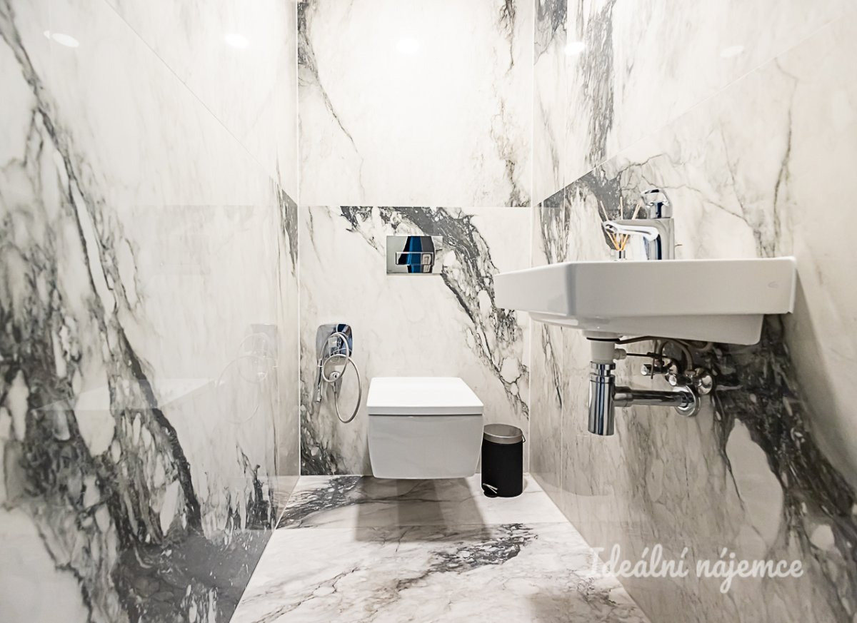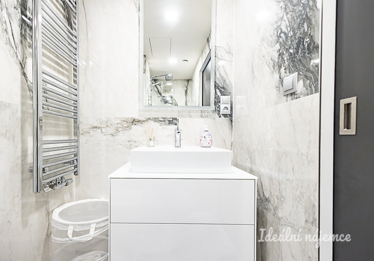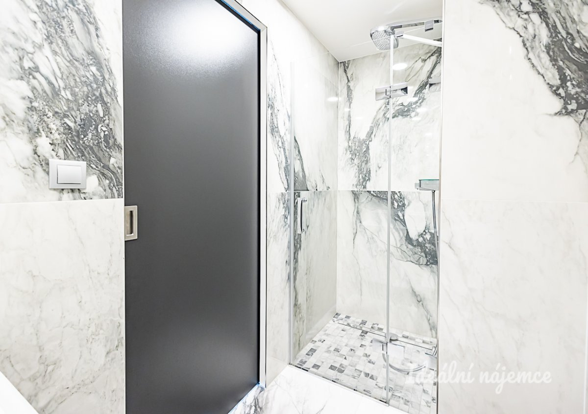 Byt je nabízen plně vybavený a připravený k okamžitému nastěhování. Kuchyně disponuje barovým posezením, lednicí s mrazákem, elektrickou i mikrovlnnou troubou, indukční varnou deskou, digestoří a myčkou. Na kuchyň plynule navazuje obývací pokoj s pohodlnou sedací soupravou, konferenčním stolkem, TV setem a jídelním koutem. V bytě jsou dále dva samostatné pokoje vybavené postelí, vestavěnou skříní a pracovním stolkem se židlí. Dominantou hlavní ložnice je luxusní manželská postel s čelem doplněná o vestavěnou skříň. Hlavní koupelna je zařízena vanou, umyvadlem, koupelnovou skříňkou a sušičkou, zatímco koupelna u ložnice nabízí sprchový kout a umyvadlo. Toaleta je samostatná.