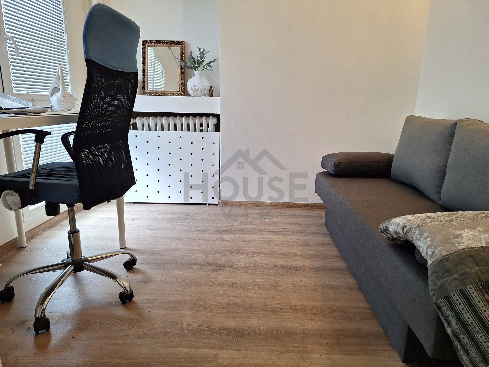 Okna jsou doplněná žaluziemi, na podlahách jsou plovoucí podlahy a dlažby, v koupelně pračka a žebříkové topení.