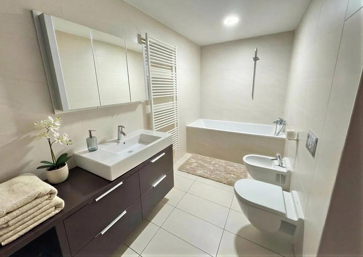 K dispozici jsou tři elegantní koupelny (vana / sprchový kout, toaleta) a samostatná toaleta pro hosty.