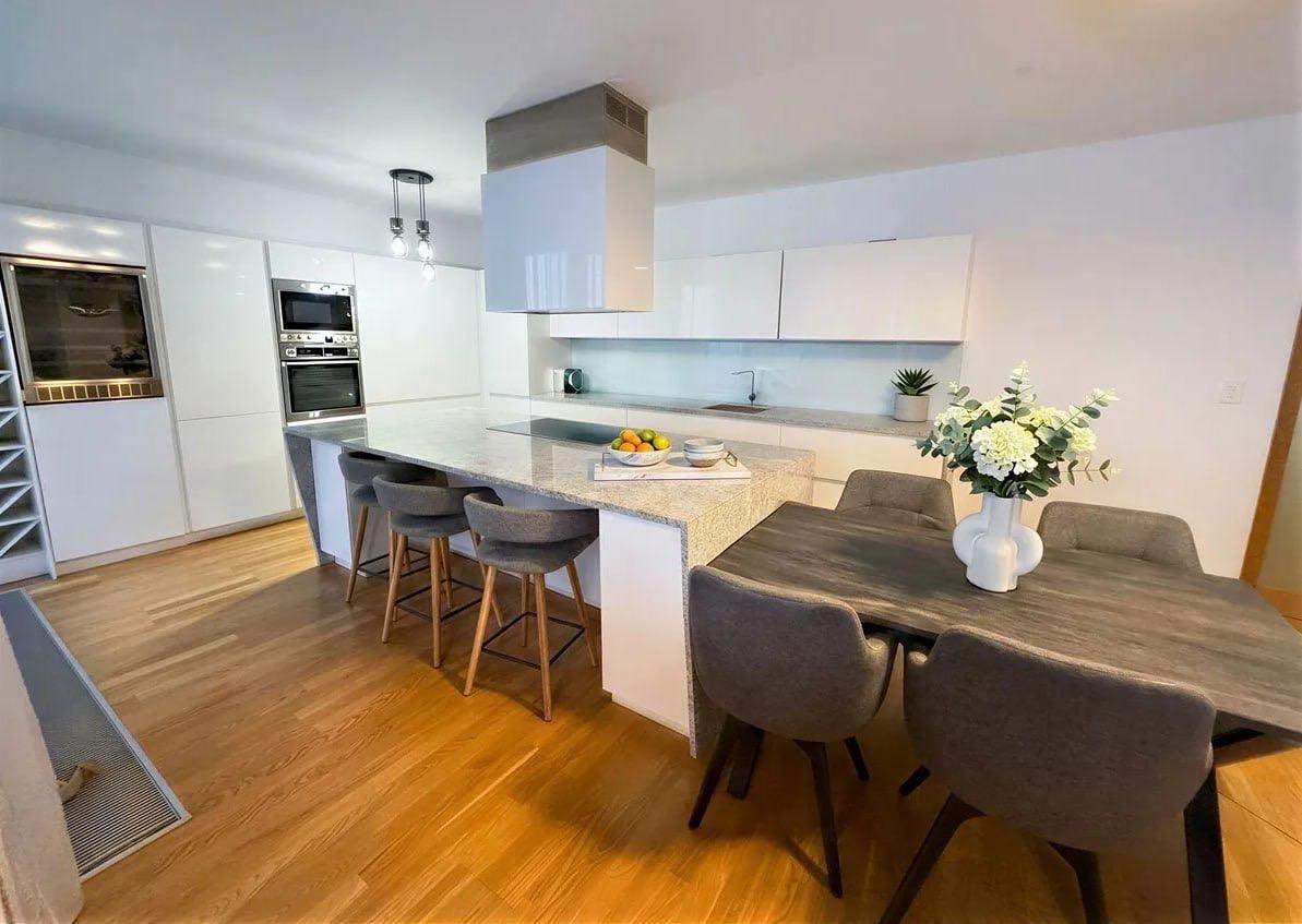 Tato nadstandardní nemovitost je kompletně zařízená s důrazem na detail a připravena k okamžitému nastěhování. Dominantou bytu je světlý a vzdušný obývací prostor s plně vybaveným kuchyňským koutem, jídelní částí, designovou sedací soupravou a TV. Kuchyň disponuje všemi vestavěnými spotřebiči (varná deska, trouba, myčka, lednice, mikrovlnná trouba).