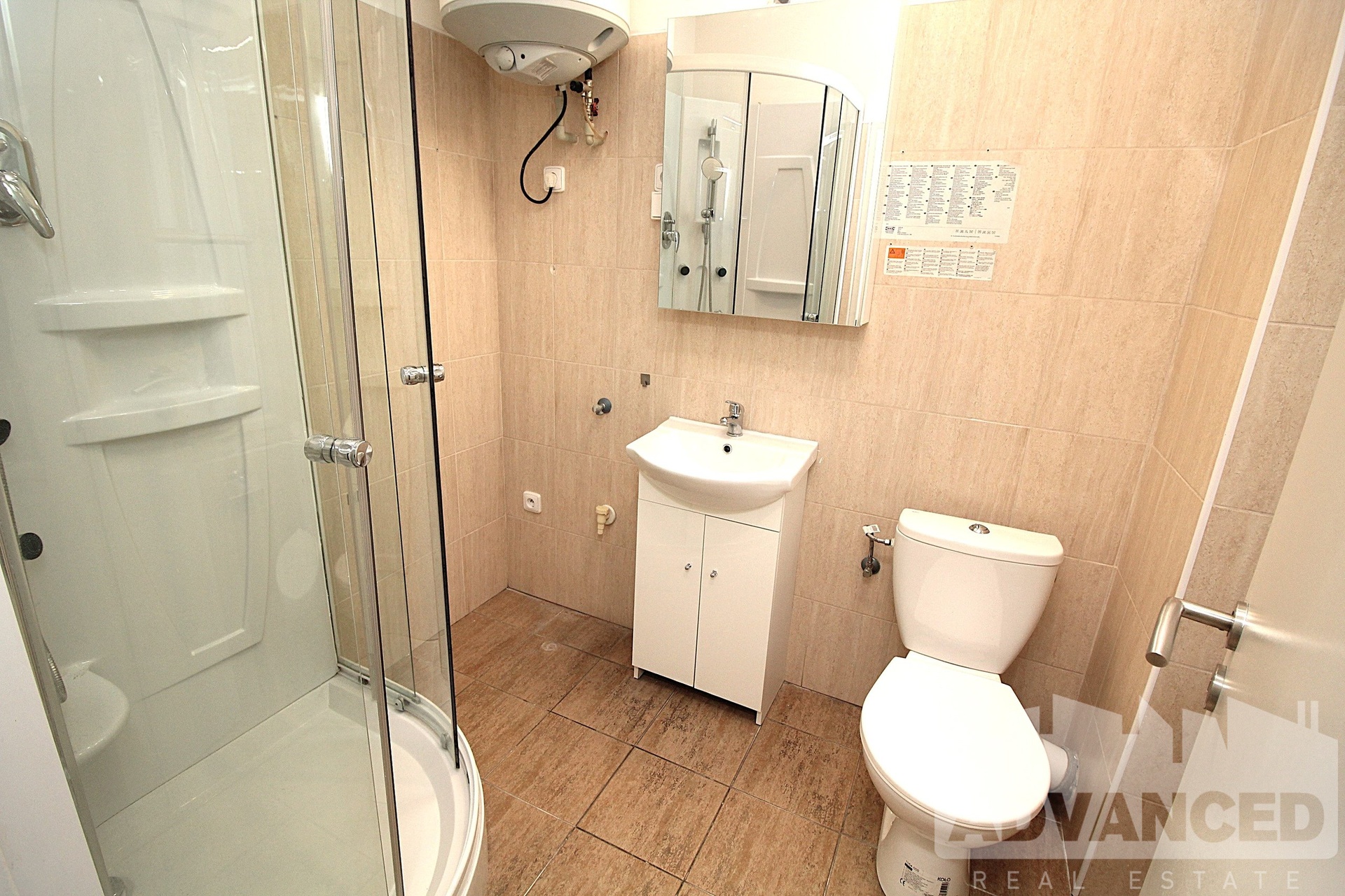 V bytě se nachází vstupní prostor s novým kuchyňským koutem (elektrická trouba, indukční deska dvou-vařič, vestavěná lednice s mrazákem a vestavěná mikrovlnná trouba), pokoj vedoucí do ulice, koupelna s umyvadlem, sprchovým koutem a připojením na pračku a s WC.