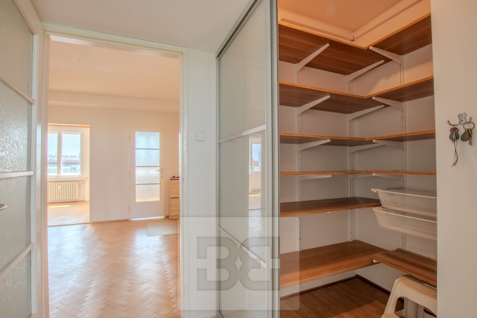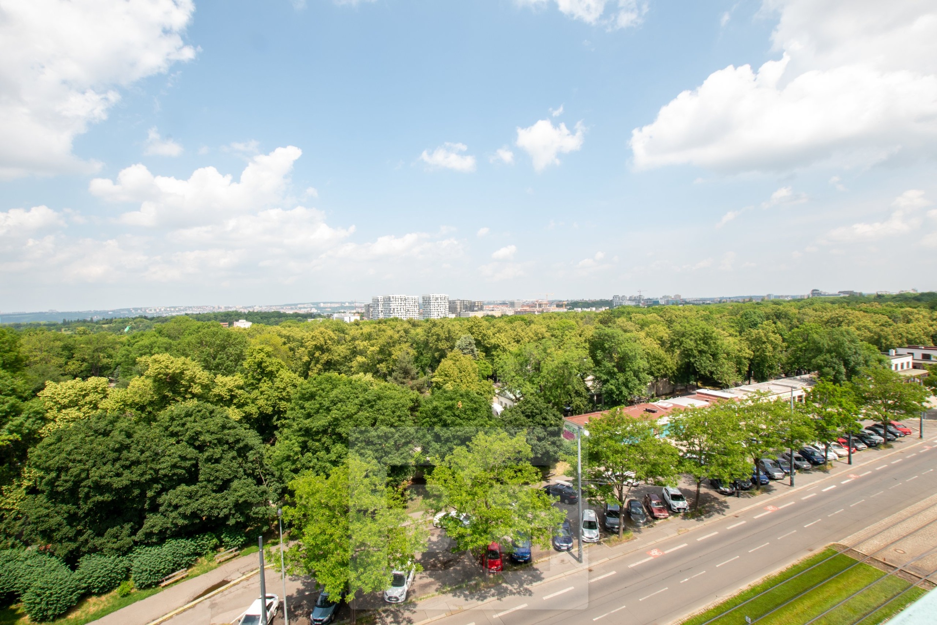 Dominantou bytu je nádherný výhled na severní část Prahy, zatímco z jižní strany se nabízí pohled do tichého vnitrobloku. Díky poloze v nejvyšším patře si byt zachovává maximální soukromí a klid.