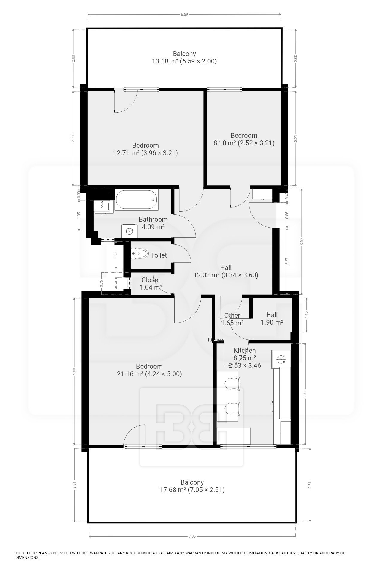 Interiér bytu je světlý, s kvalitními dřevěnými podlahami ve všech místnostech. Dispozice zahrnuje tři samostatné pokoje a oddělenou kuchyň s přístupem na jednu z teras. Všechny místnosti jsou přístupné z centrální předsíně. Kuchyň je vybavena moderní kuchyňskou linkou se spotřebiči – lednicí s mrazákem, dvouplotýnkovou varnou deskou, troubou, digestoří a myčkou. Součástí kuchyně je rovněž praktická komora.