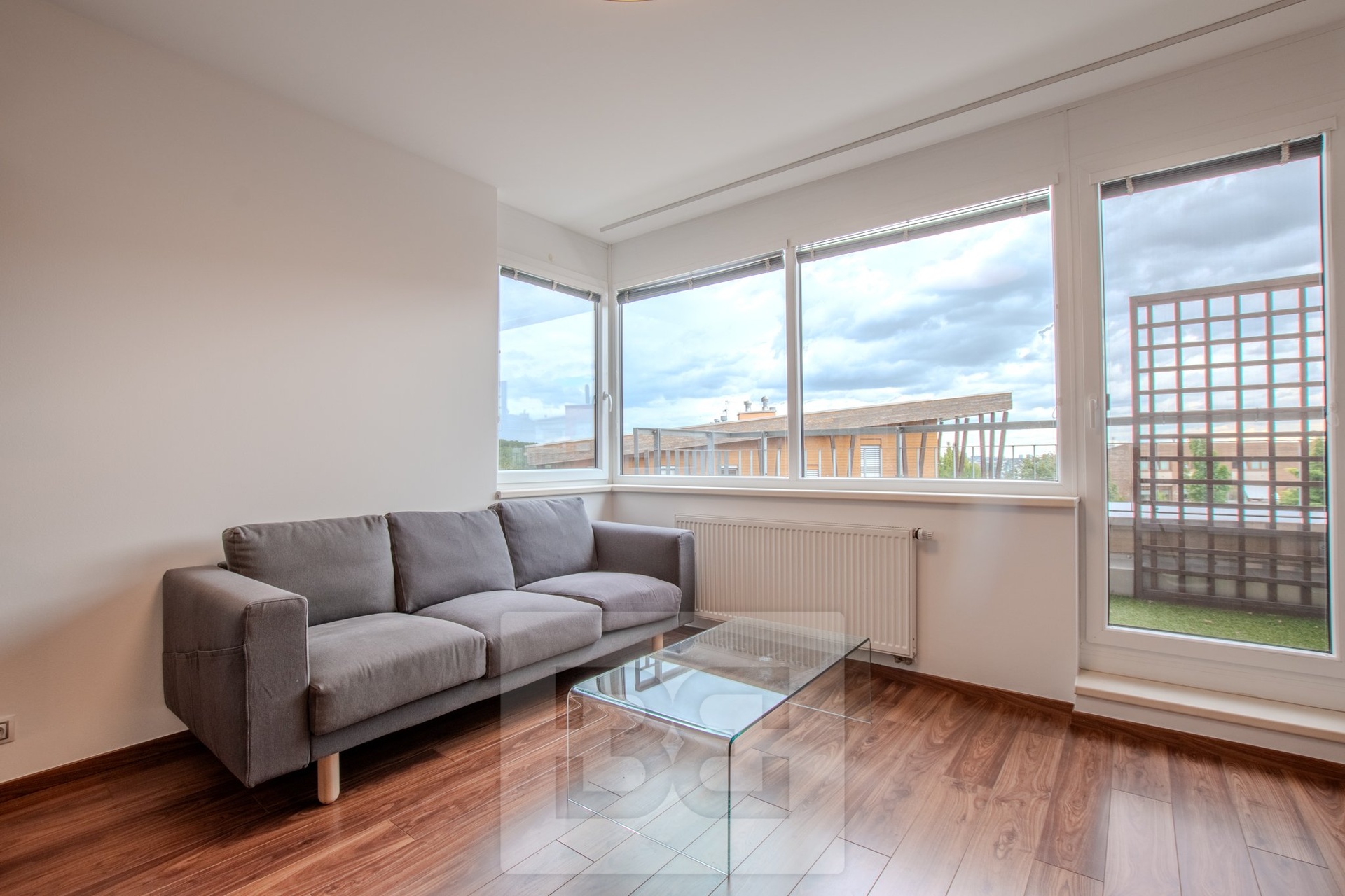 Byt je částečně zařízený, vybaven kvalitními materiály a nabízí promyšlené dispoziční řešení. Z obývacího pokoje je přístup na východně orientovaný balkon o výměře 4 m² s krásným výhledem na Prahu. Moderní kuchyňský kout je vybaven linkou se spotřebiči – lednicí s mrazákem, varnou deskou, troubou, digestoří a myčkou. Obývací část dále disponuje jídelním stolem, pohodlnou pohovkou a televizí.