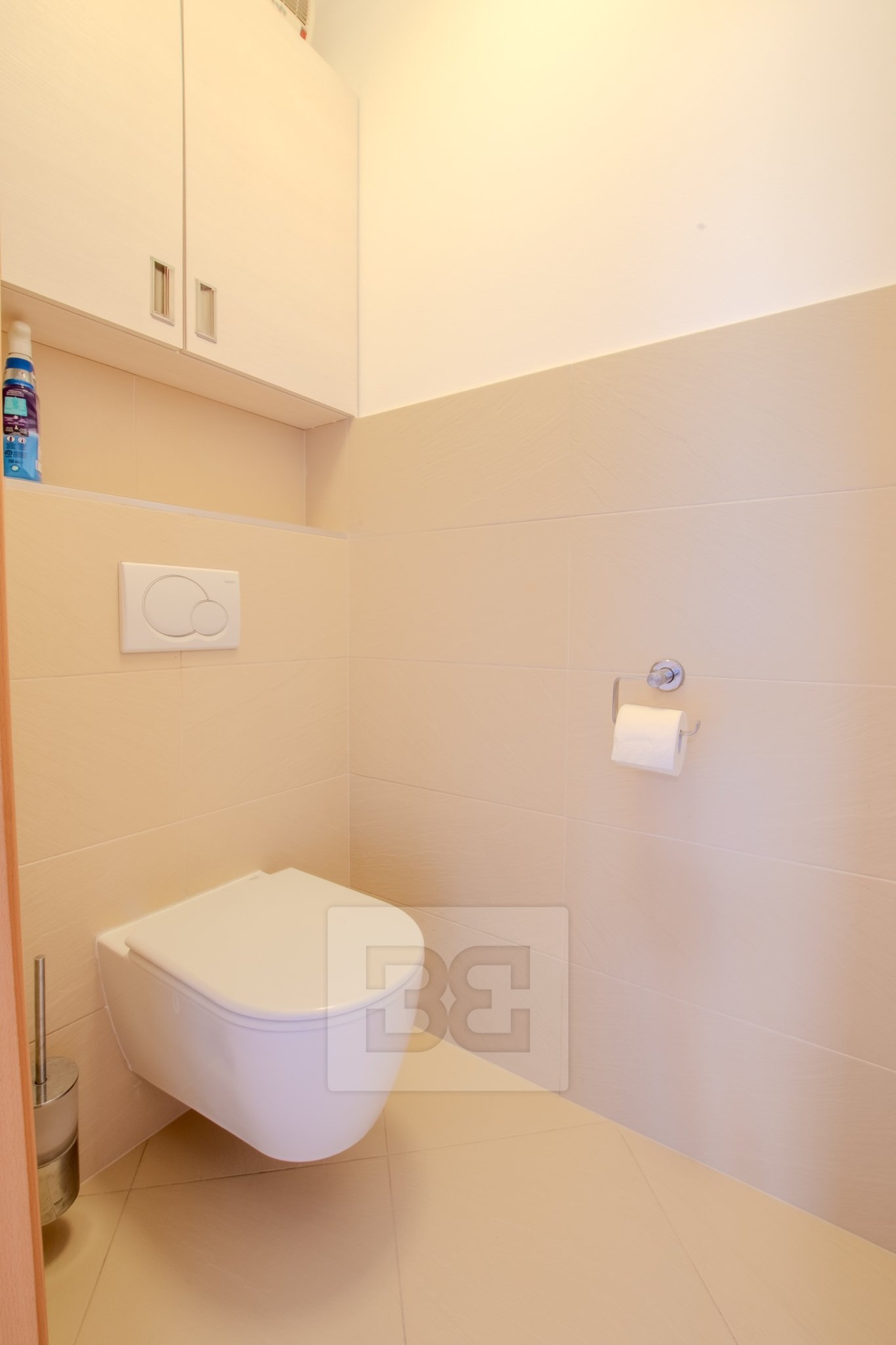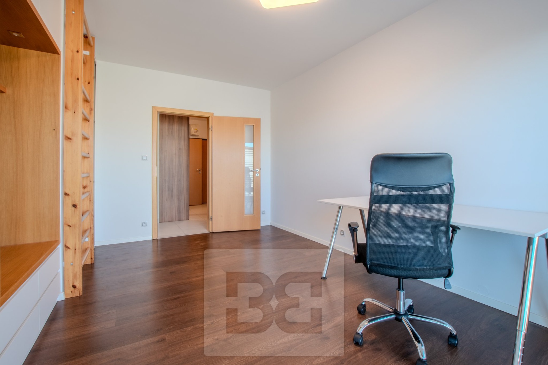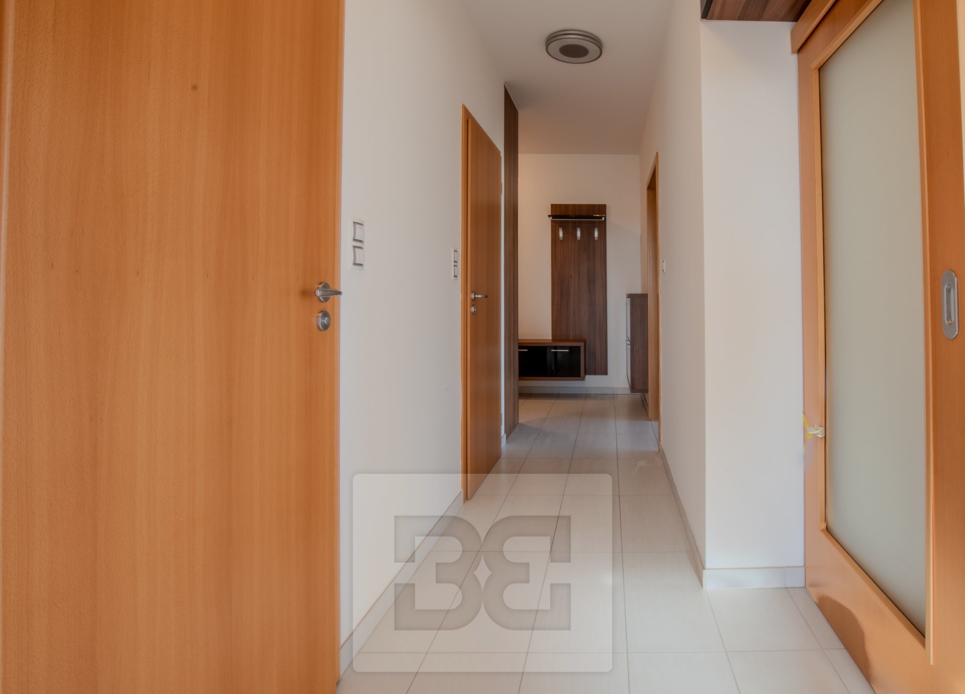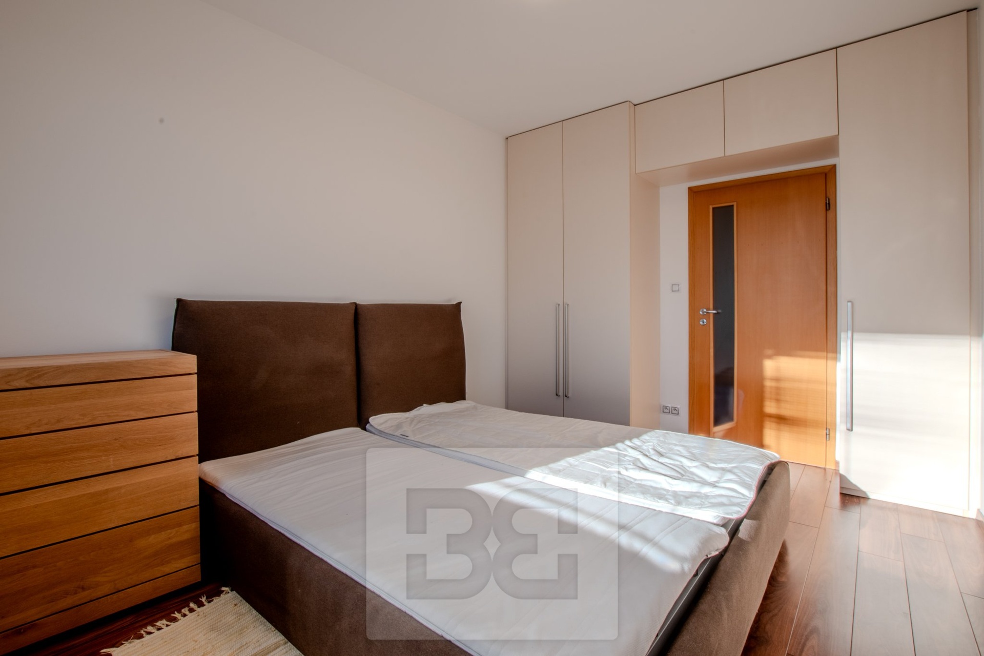 Byt má dvě samostatné ložnice, umístěné na opačných stranách bytu, což zajišťuje maximální soukromí. Hlavní ložnice je vybavena manželskou postelí a vestavěnou šatní skříní. Druhá ložnice je zařízena šatní skříní a pracovním stolem se židlí. Koupelna je prostorná a nabízí dvě umyvadla, vanu a pračku. Toaleta je samostatná. V předsíni se nachází vestavěná skříň a praktická komora, kterou lze využít jako šatnu nebo úložný prostor.