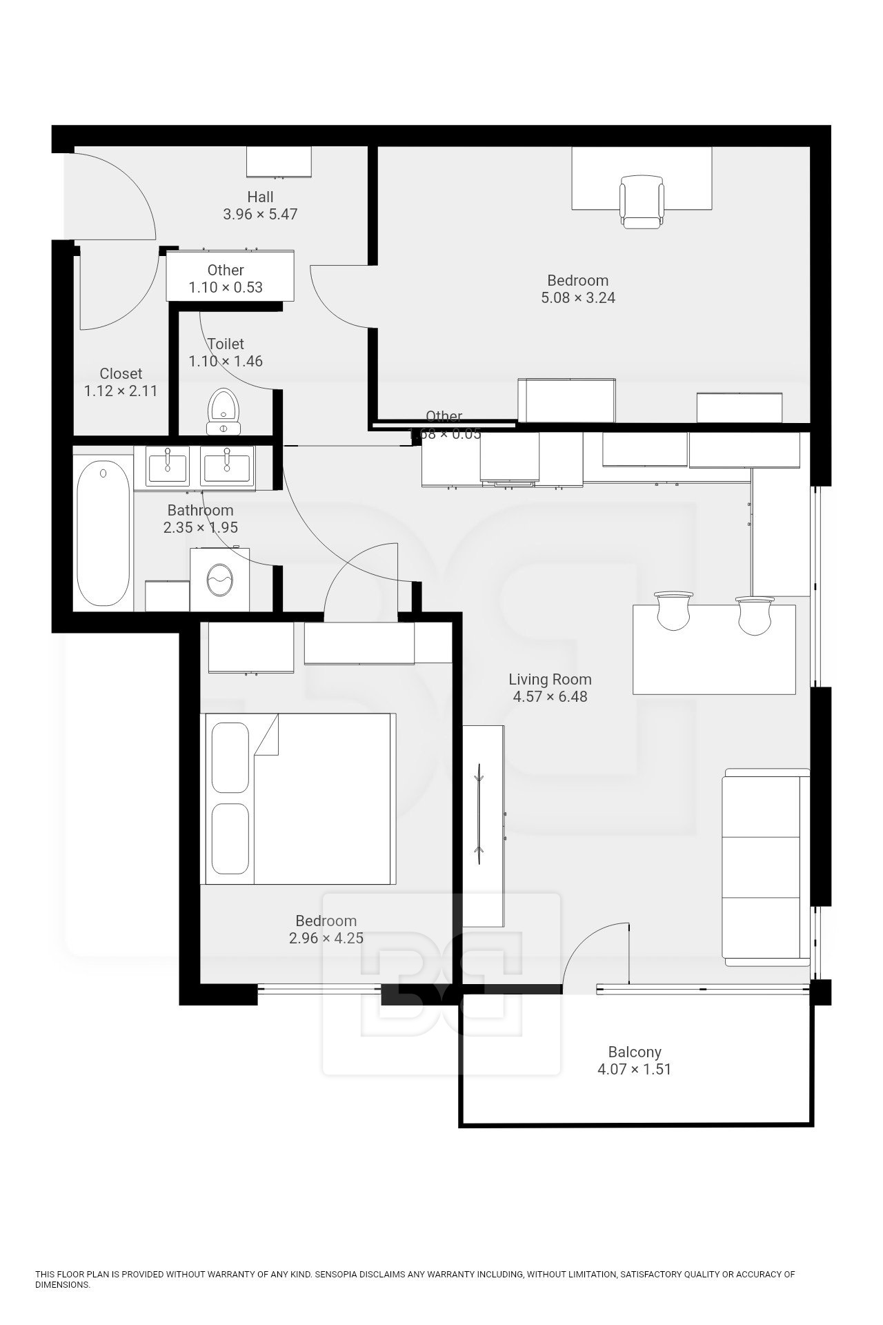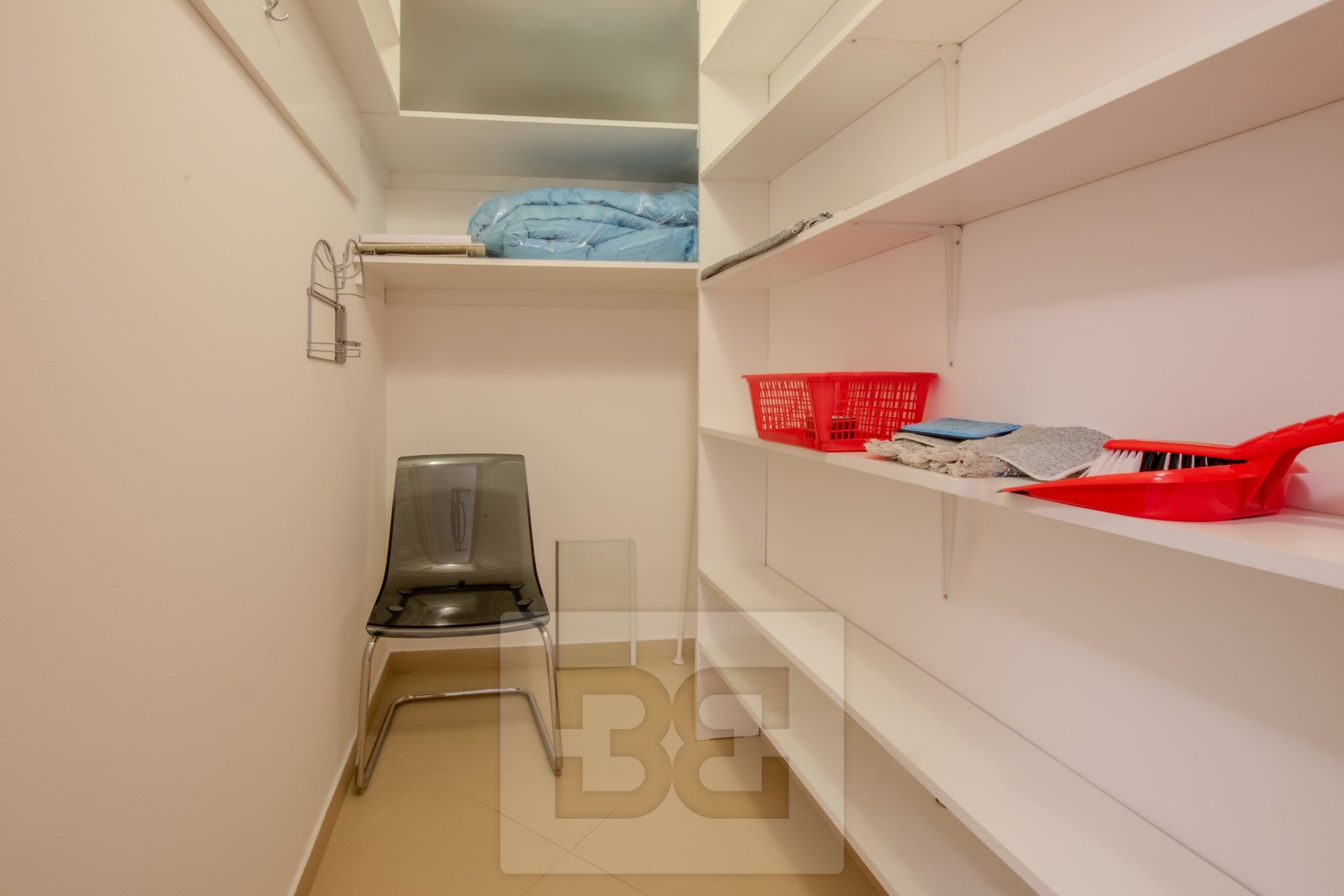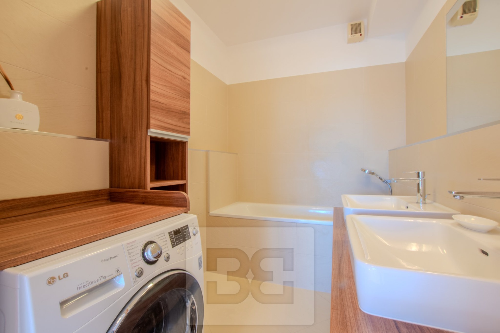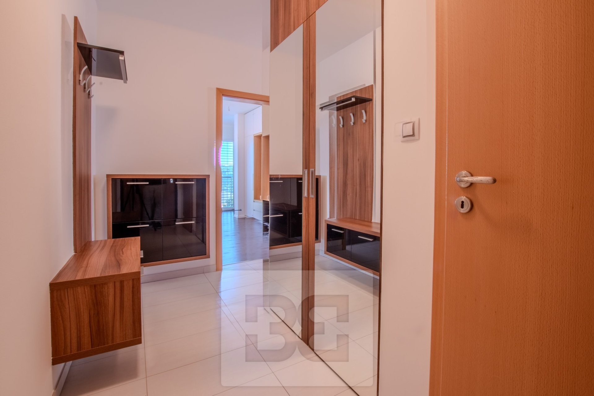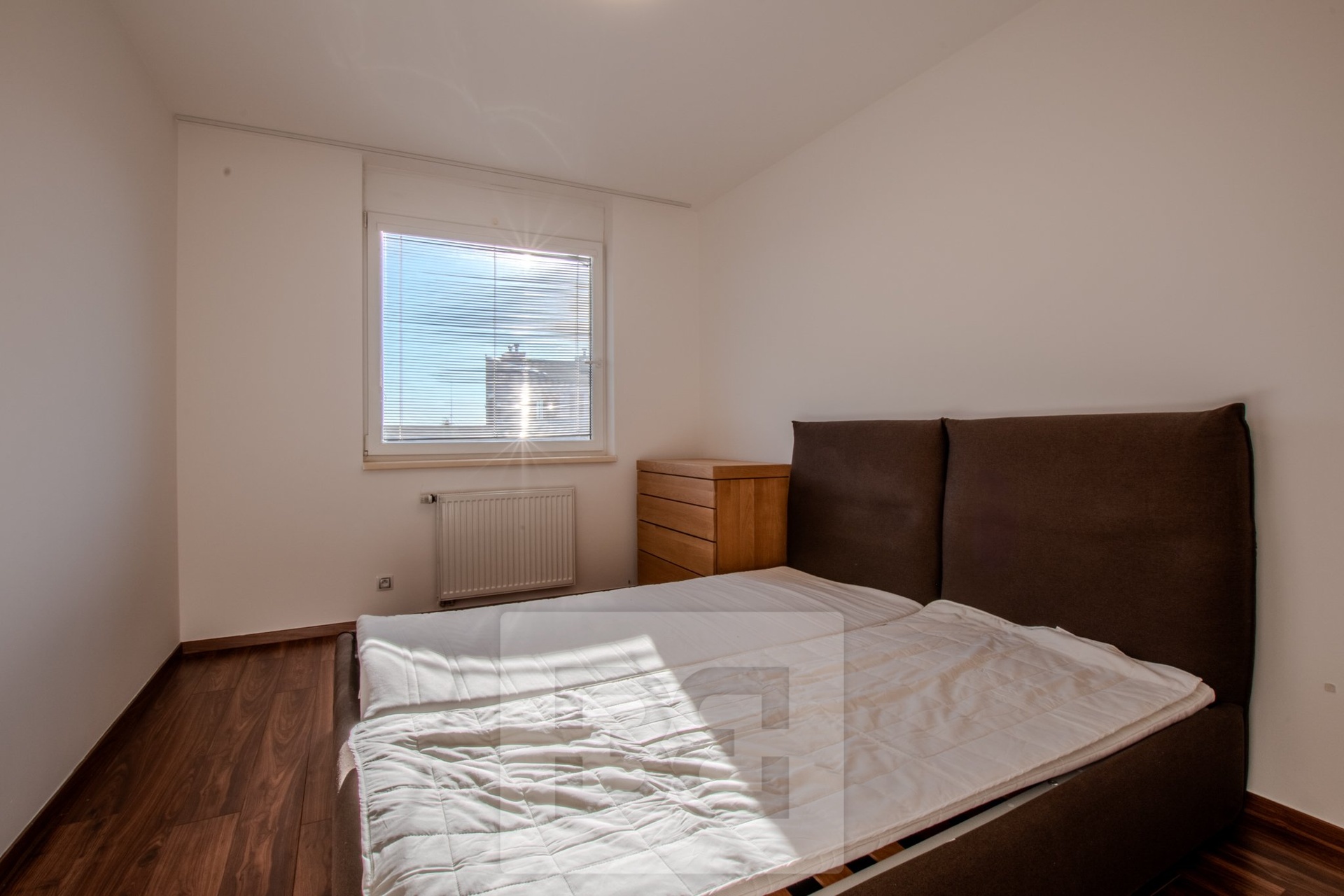 Byt má dvě samostatné ložnice, umístěné na opačných stranách bytu, což zajišťuje maximální soukromí. Hlavní ložnice je vybavena manželskou postelí a vestavěnou šatní skříní. Druhá ložnice je zařízena šatní skříní a pracovním stolem se židlí. Koupelna je prostorná a nabízí dvě umyvadla, vanu a pračku. Toaleta je samostatná. V předsíni se nachází vestavěná skříň a praktická komora, kterou lze využít jako šatnu nebo úložný prostor.
