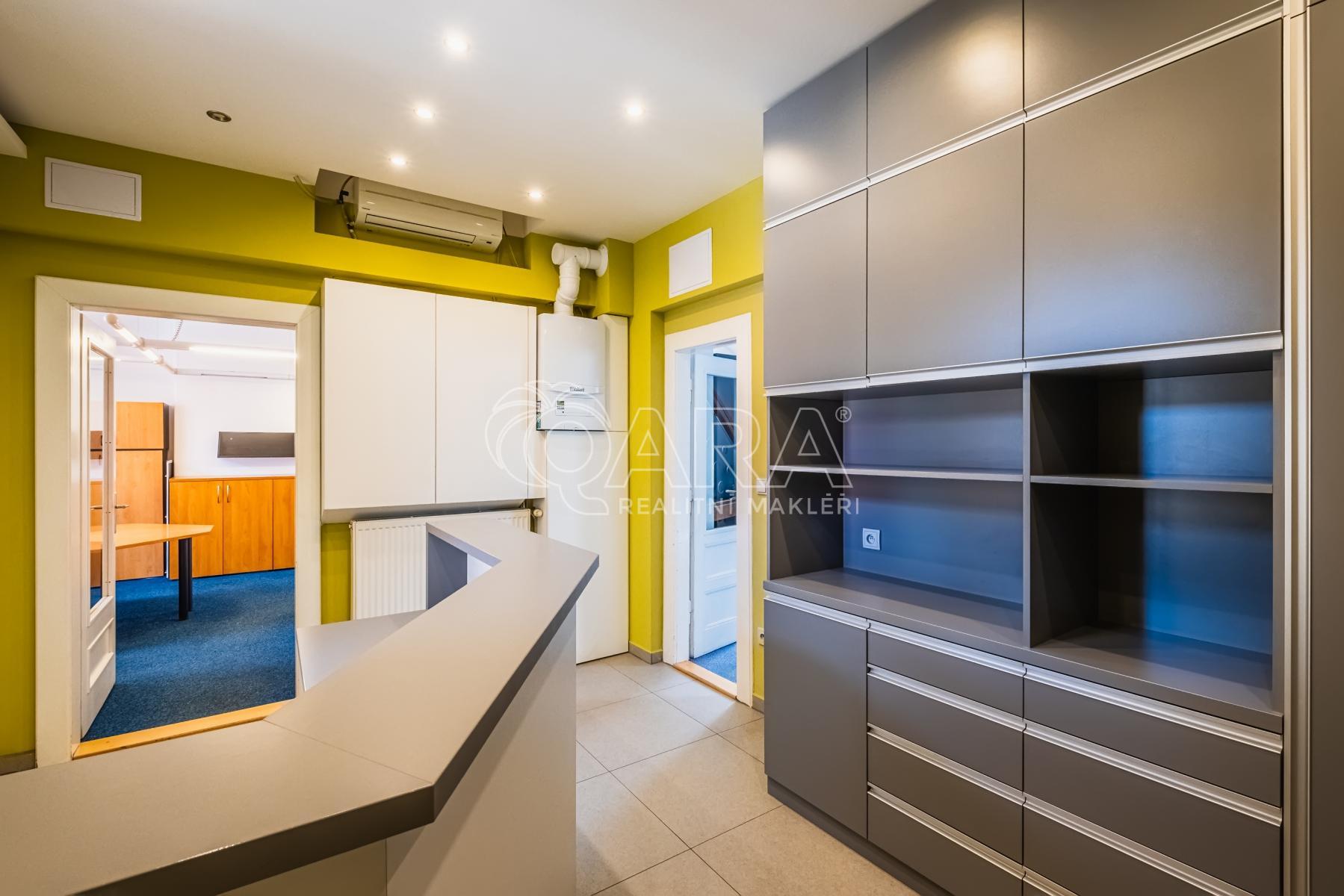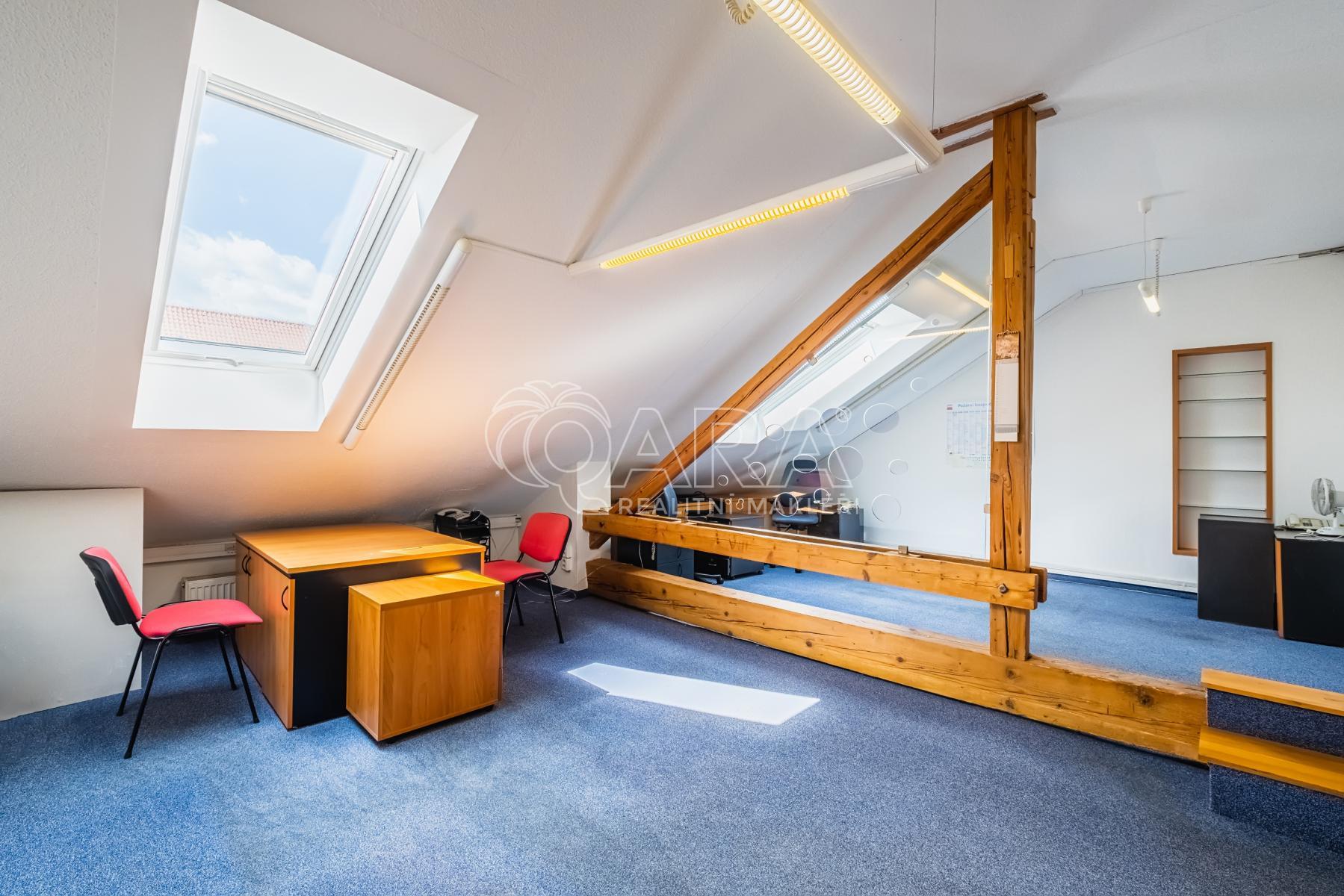 Exkluzivní kanceláře s vlastní recepcí, kuchyňkou a sociálním zařízením jsou situovány v poslední patře cihlového domu s výtahem.