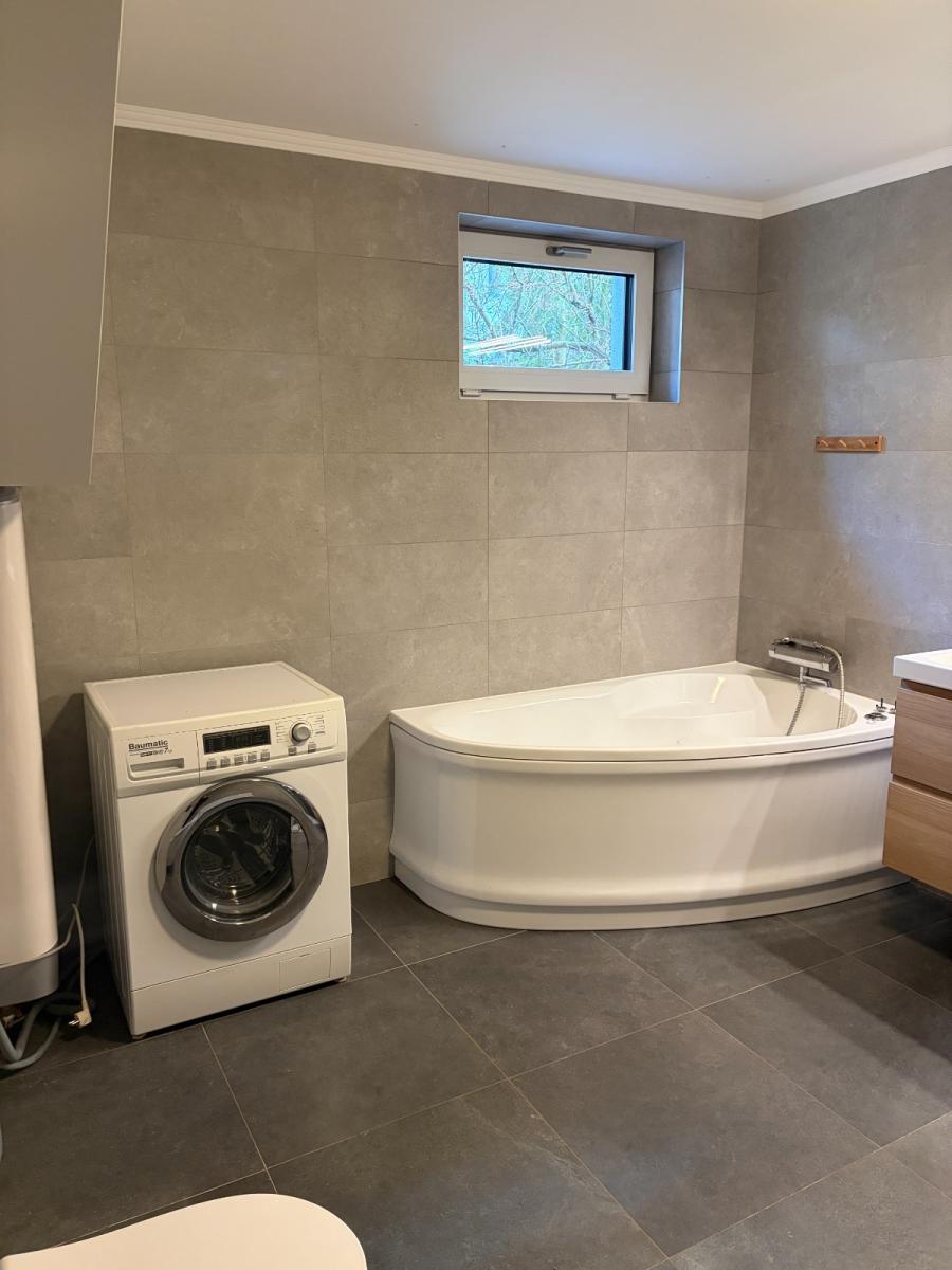 V přízemí se nachází vstupní hala, prostorný obývací pokoj s plně vybavenou kuchyňskou linkou IKEA a jídelním koutem. Z obývacího pokoje je přímý vstup na terasu o velikosti cca 20 m and sup2; a dále na zahradu. Dále je zde koupelna s vanou, sprchovým koutem, dvěma umyvadly, toaletou a pračkou.