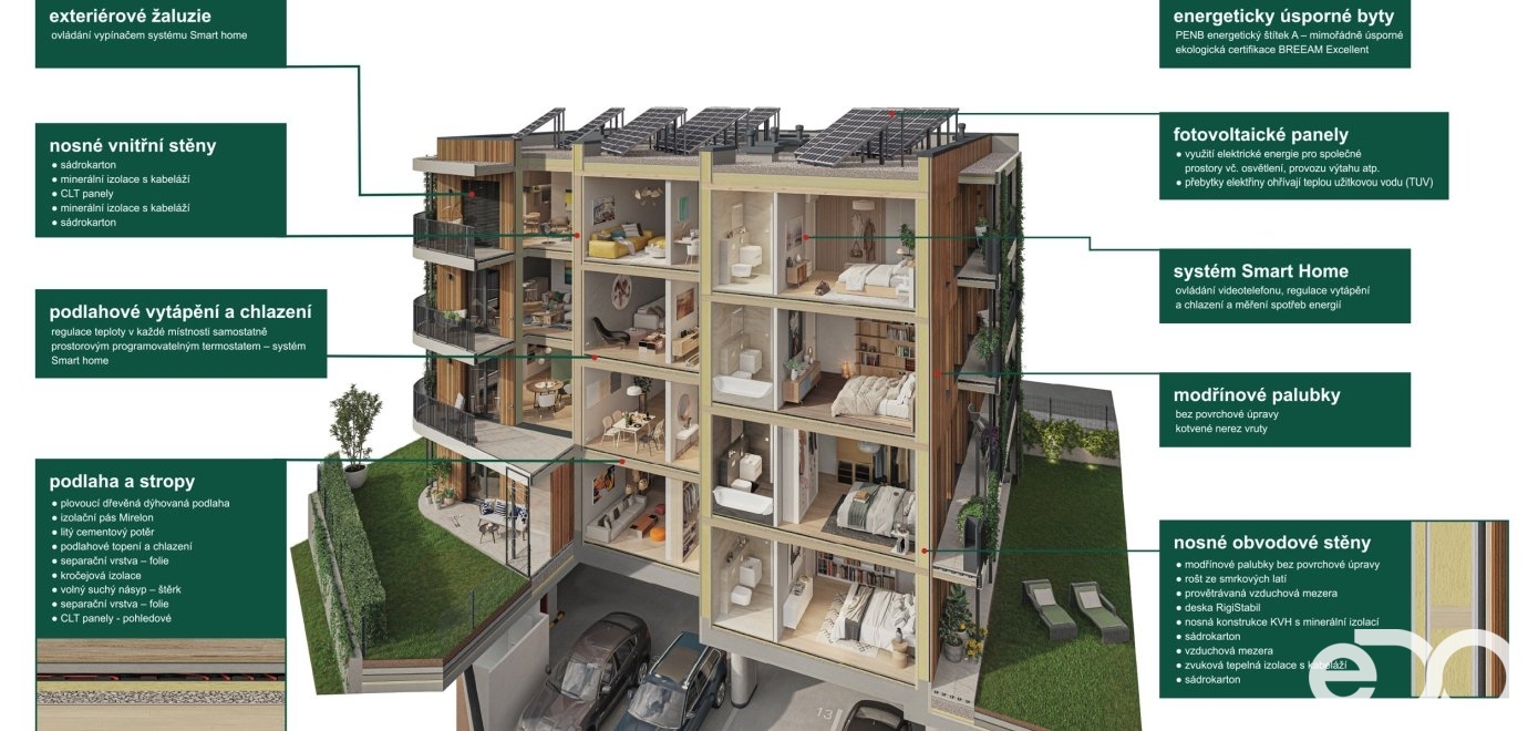 Rezidenční dům TIMBER je první svého druhu v ČR – kombinuje skelet z recyklovaného betonu s masivními CLT panely z certifikovaného dřeva. Stavba vyniká vysokým standardem provedení s důrazem na ekologii, udržitelnost a zdravé bydlení, což potvrzuje i cílená certifikace BREEAM Excellent. Bytový dům je tedy díky použitým technologiím jako jsou tepelná čerpadla či FVE velice úsporný na provoz.