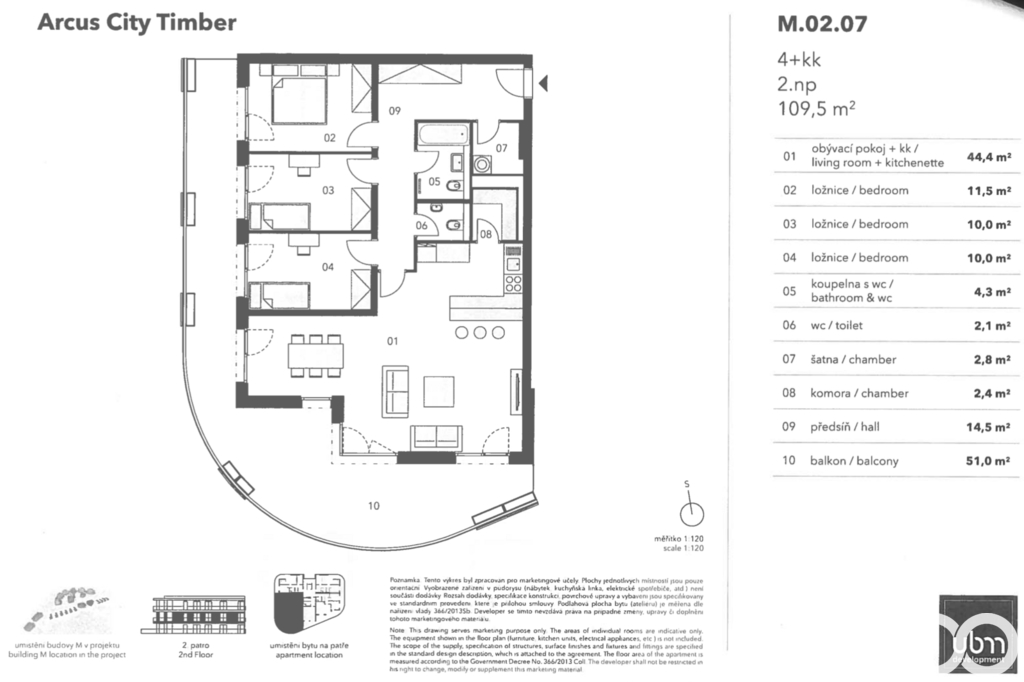 Bytová jednotka o celkové užitné ploše 168 m² se nachází ve 2. podlaží budovy a je zcela nová, dosud neobývaná. Užitná plocha bytu, tedy plocha obytných místností uvnitř vnějších stěn nemovitosti, je 110,6 m². Skládá se z chodby s novou vestavěnou skříní na míru, tří ložnic, obývacího pokoje s novou kuchyní na míru, koupelny s vanou a WC, samostatného WC, technické místnosti a komory. Ze všech pokojů je možný vstup na krytý balkon (51,0 m²). Byt je orientovaný na jihozápad. Kuchyně je vybavena spotřebiči značky Brandt – indukční varná deska s digestoří, elektrická trouba, myčka a lednice s mrazákem. K bytu náleží velký zděný sklep (6,2 m²) a dvě garážová parkovací stání s možností využití 1 wallboxu. Stání nejsou obsažena v ceně.