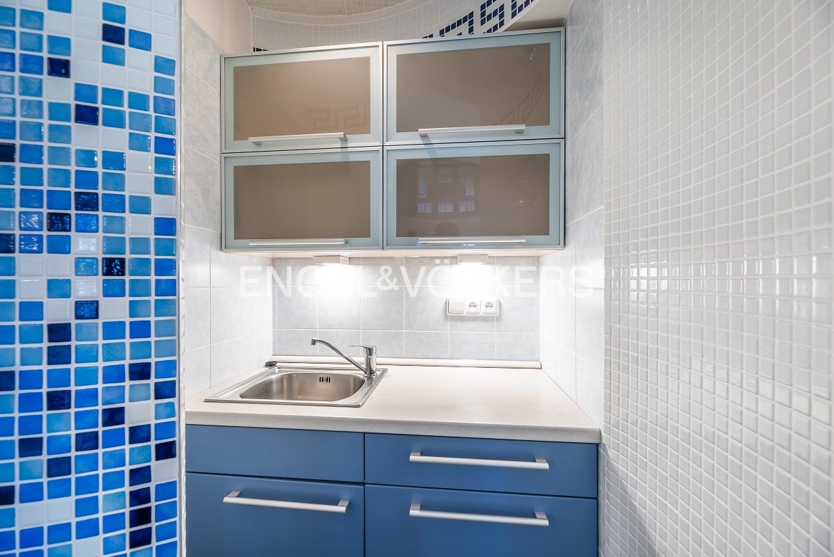 Jedná se o atypický prostor s unikátním designem. Interiér upoutá modrým stropem, kachličkovými stěnami a dlažbou na podlaze, což vytváří neobvyklou, ale zajímavou atmosféru. Součástí kanceláří je také menší kuchyňský kout bez vybavení a spotřebičů a sociální zázemí, které nájemcům zajišťuje potřebný komfort.