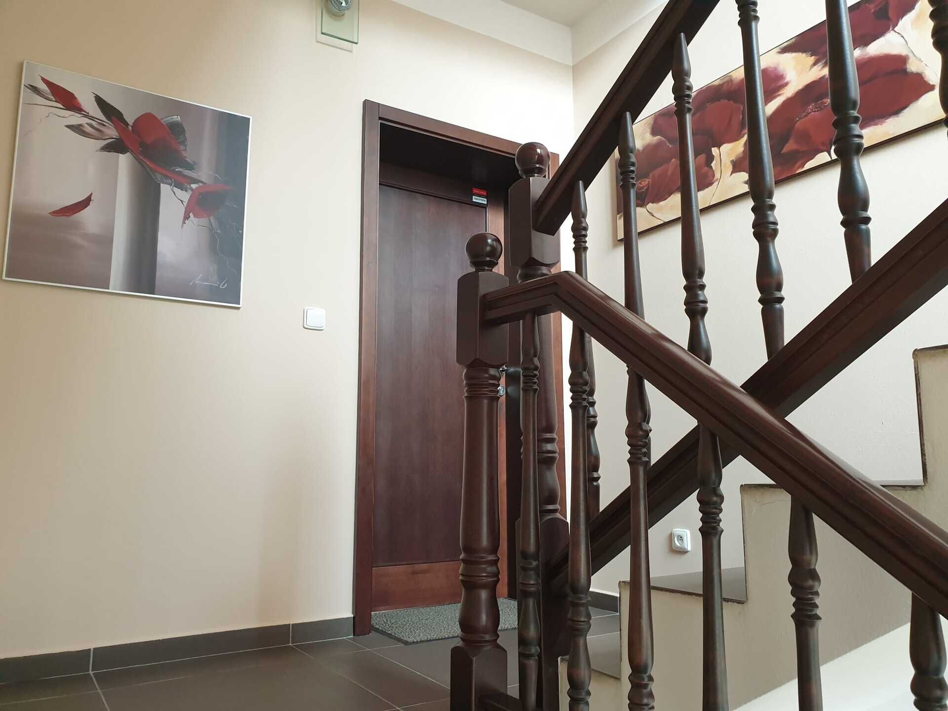 V předsíni, kuchyni a velké místnosti s balkonem jsou posuvné dveře. V ostatních místnostech jsou velmi kvalitní dřevěné dveře na zakázku.