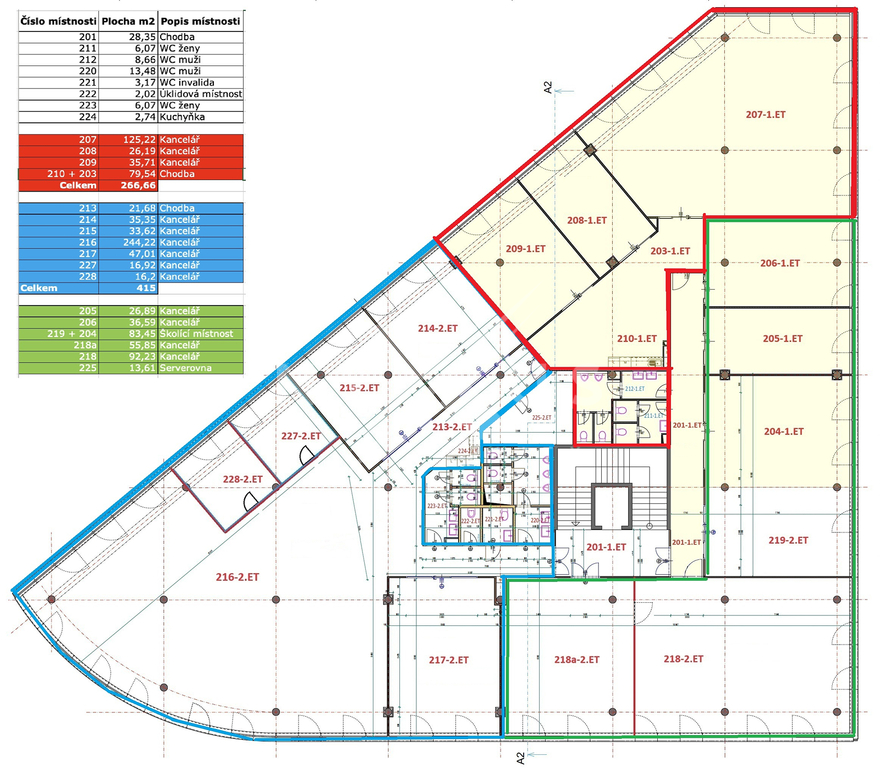 - 6x kancelář (244,22 m², 47,01 m²; 35,35 m²; 33,62 m²; 16,92 m²; 16,2 m²)