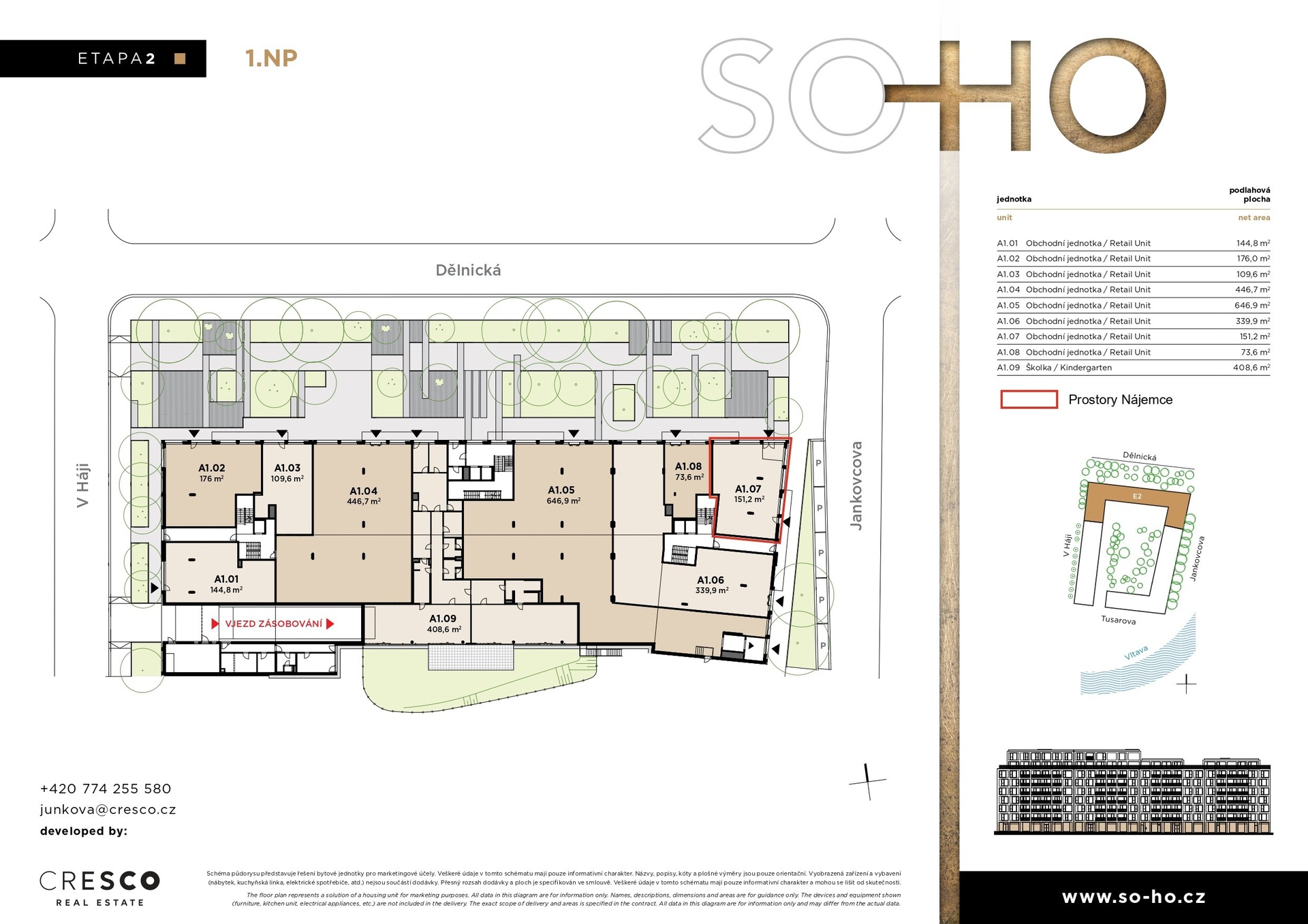 Nabízíme k pronájmu atraktivní komerční prostor o velikosti 151,2 m² v parteru druhé etapy SO-HO Rezidence. Prostor je ideální pro obchod se specialitami či bio produkty, kadeřnictví, kosmetický salon nebo jiné služby. Jednotka bude předána ve stavu shell & core, připravená k individuálním úpravám a dokončení dle potřeb nájemce.