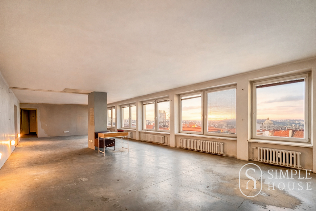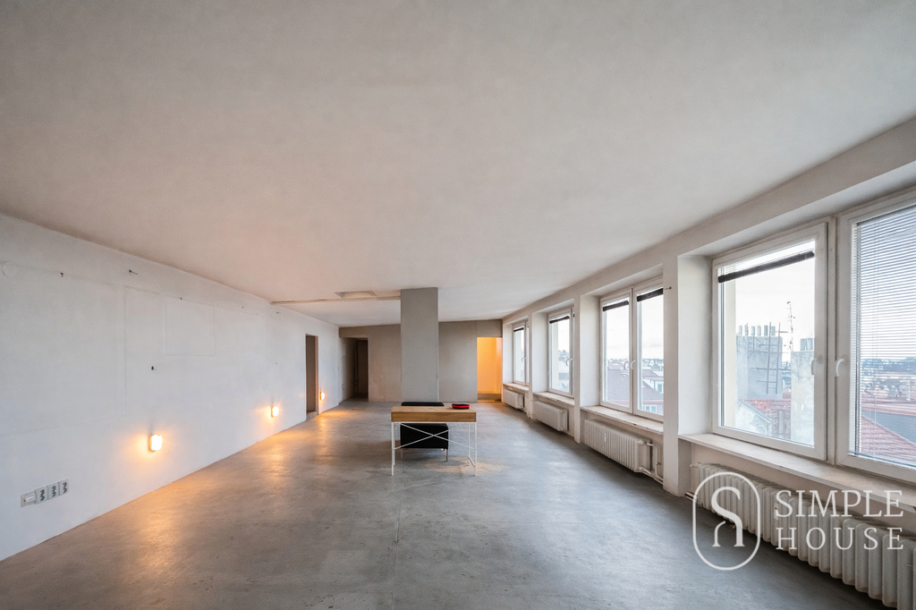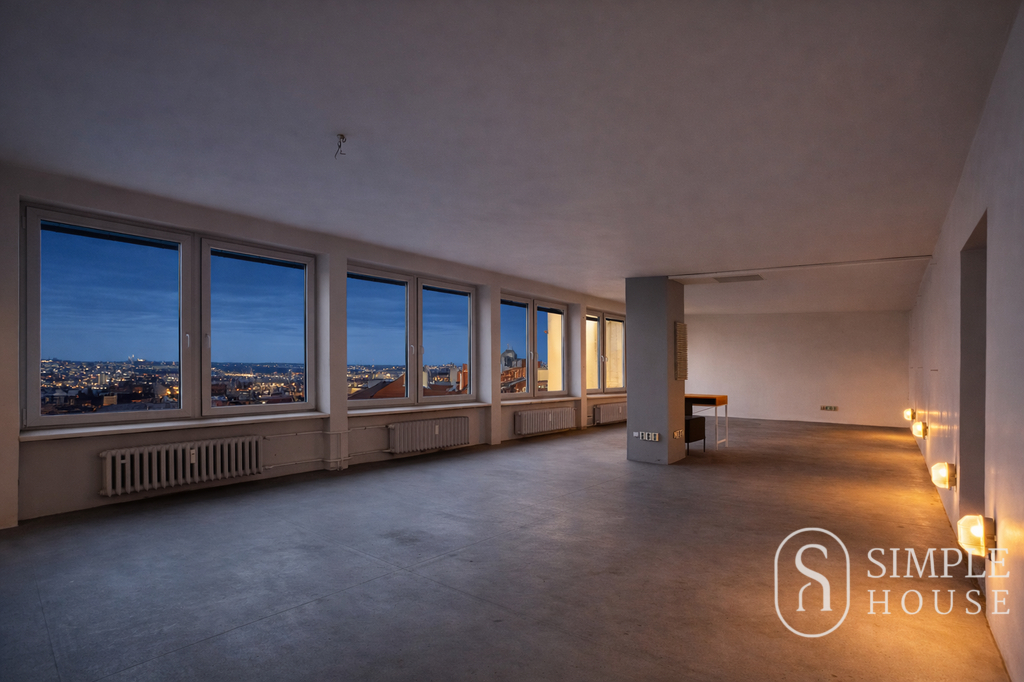 Unikátnost tohoto prostoru spočívá především ve výhledu na Prahu a ve velkých oknech, díky nimž se atmosféra interiéru přirozeně mění podle počasí a denní doby. Prostor působí pokaždé jinak – od jemného ranního světla až po dramatickou večerní náladu. V kombinaci s podkrovním charakterem a otevřenou dispozicí nabízí místo, které má osobnost a inspiruje.