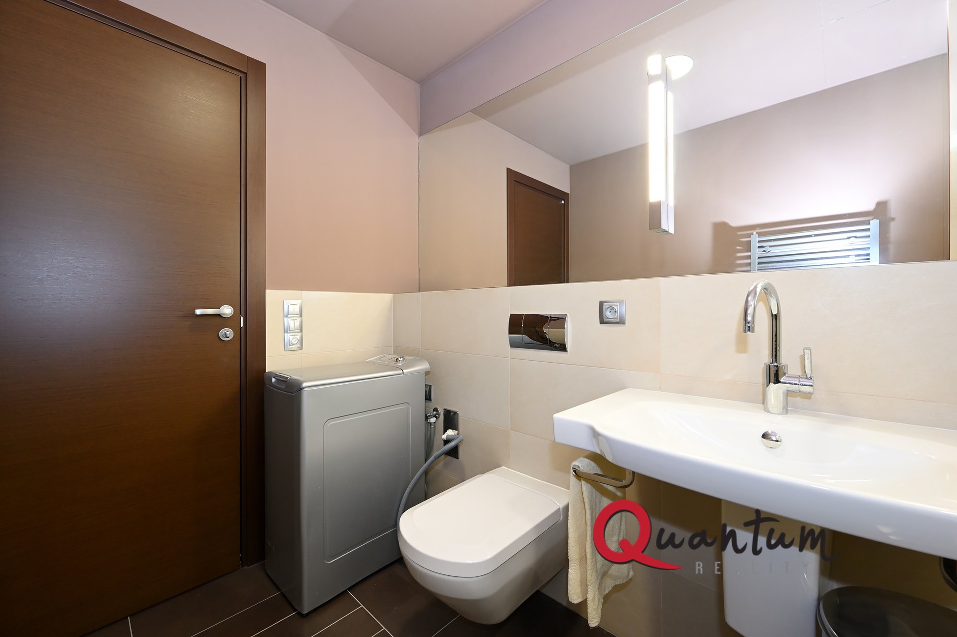 Byt je navržen s důrazem na detail, praktičnost a čistý moderní design. Dispozice sestává ze vstupní chodby s vestavěnými designovými šatními skříněmi, které nabízejí dostatek úložného prostoru. Koupelna je vybavena sprchovým koutem walk-in, toaletou a s umyvadlem v elegantním provedení.