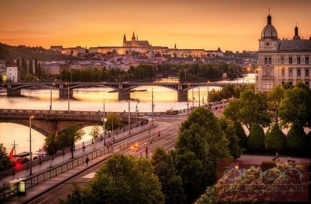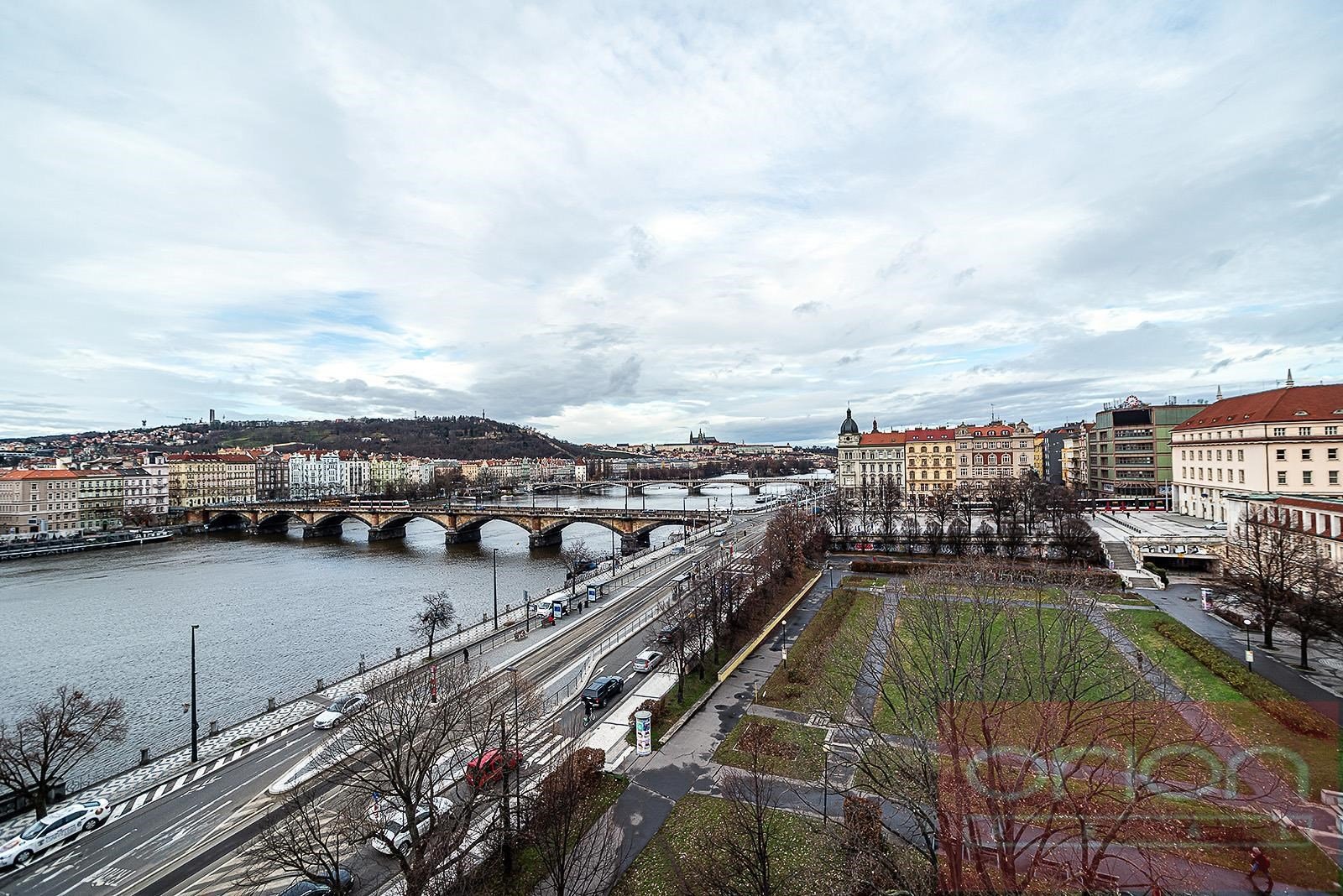 velkorysý obývací pokoj (74 m²) s nádherným výhledem na Vltavu a Hradčany