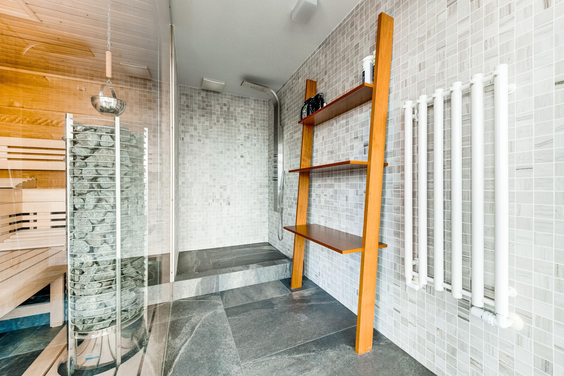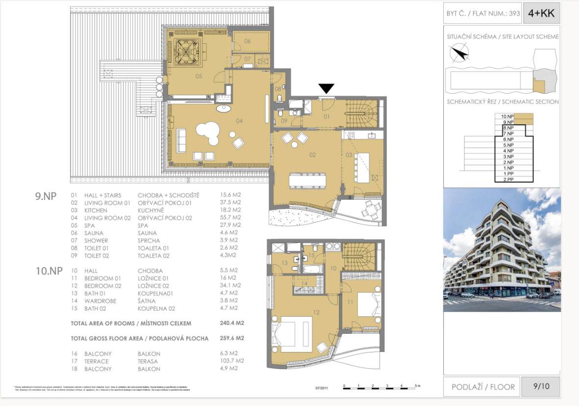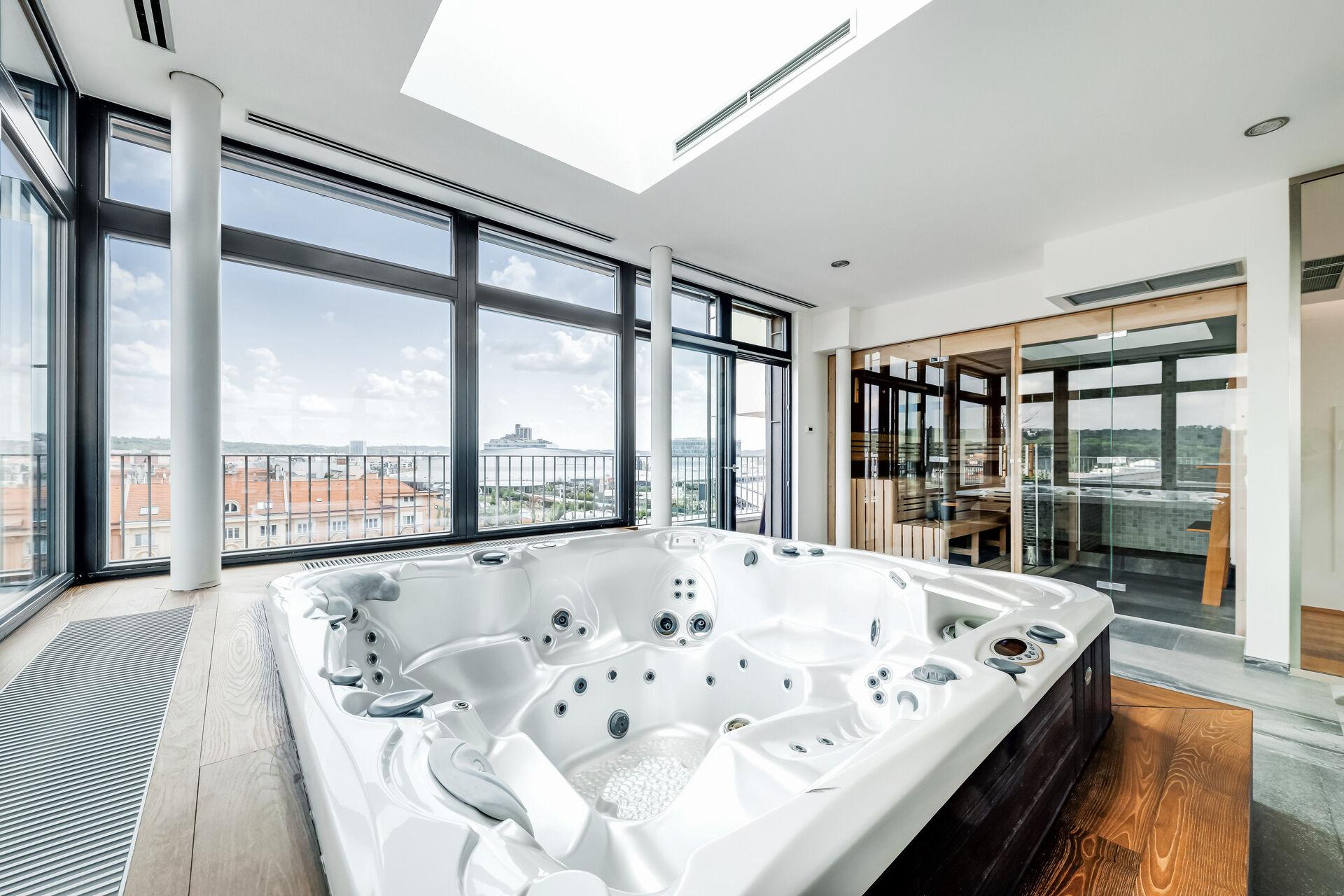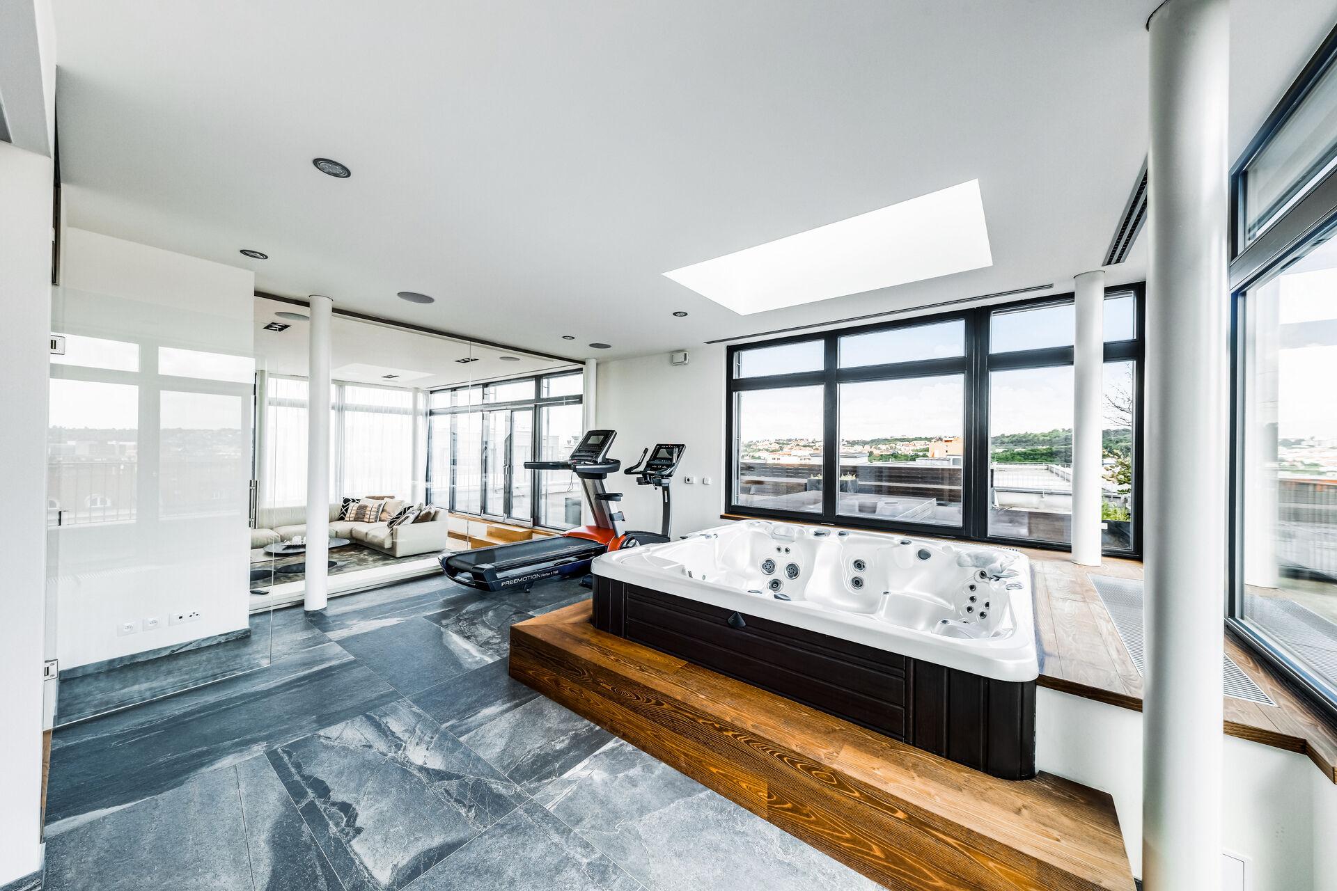 Klimatizovaný byt disponuje plochou o výměře 259m2. Celé spodní podlaží tvoří otevřenou entertainment zónu rozčleněnou na prostorný reprezentativní obývací pokoj, velkorysou jídelnu a kuchyň o celkové ploše 111m2, dále domácí fitness, které vám zajistí dokonalé pohodlí i soukromí. Pro relaxaci můžete využít wellness zónu s vířivkou a saunou.