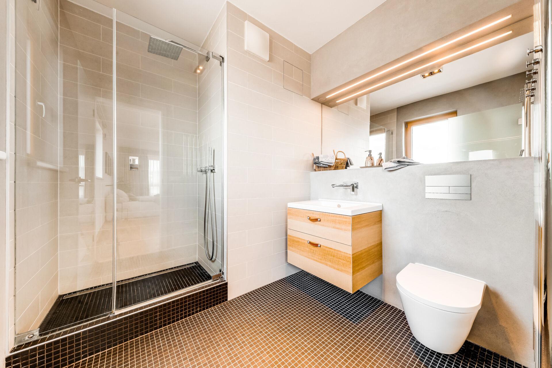 Schodiště odděluje část bytu s ložnicemi ve druhém podlaží, kde najdete dvě ložnice a dvě koupelny. Hlavní ložnice o výměře 34m2 disponuje koupelnou se sprchovým koutem a šatnou, k menší ložnici pak náleží koupelna s vanou přístupná z chodby. Ložnice mají společný balkon.