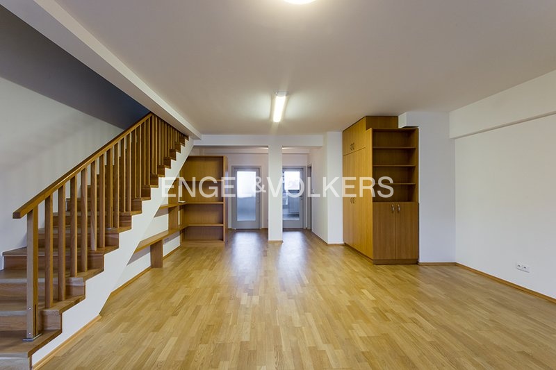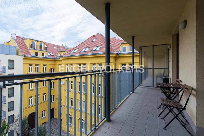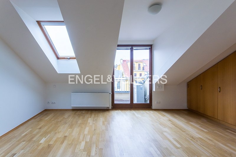 K pronájmu je připravený mezonetový atelier, který se nachází ve 4. a 5. nadzemním podlaží činžovního domu s výtahem. V prvním podlaží ateliéru se nachází vzdušný obývací prostor se vstupem na balkon, jídelna, samostatná kuchyně plně vybavená všemi spotřebiči a koupelna. V horním patře jsou tři prostorné místnosti, které lze využít jako ložnice, pracovny či ateliérové zázemí, a dále druhá koupelna.