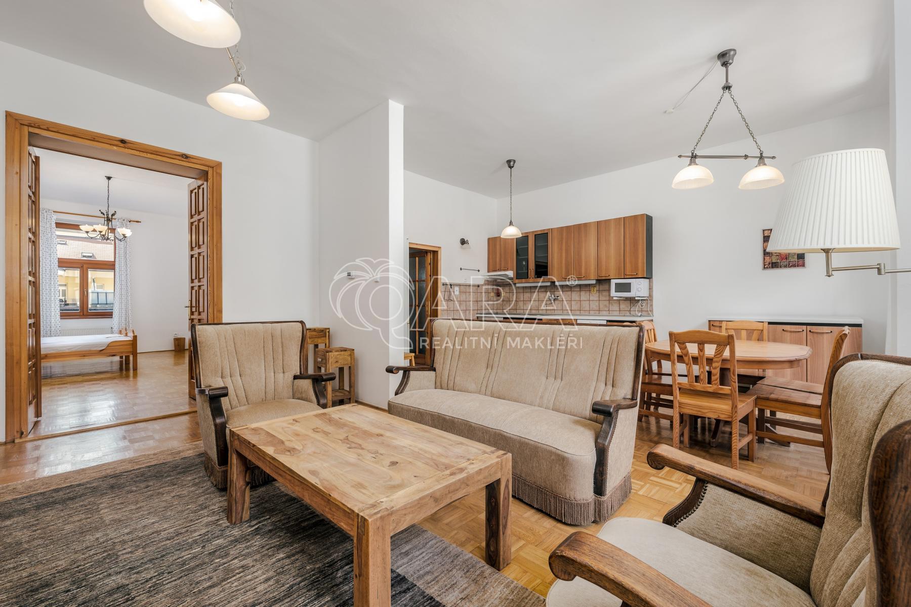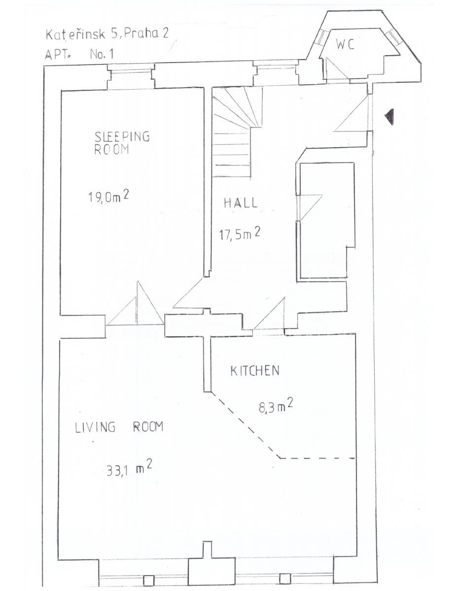 Nabízíme k pronájmu krásný mezonetový byt v prestižní ulici Kateřinská, v samém centru Prahy. Tento prostorný a světlý byt o podlahové ploše 161 m and sup2; je vymezen ve 2. a 3. nadzemním podlaží a nabízí komfortní bydlení s dostatkem prostoru i soukromí.
