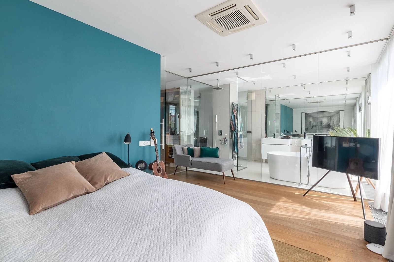 Dominantou bytu je prostorná střešní terasa s úchvatným výhledem na kostel Nejsvětějšího Srdce Páně na náměstí Jiřího z Poděbrad.