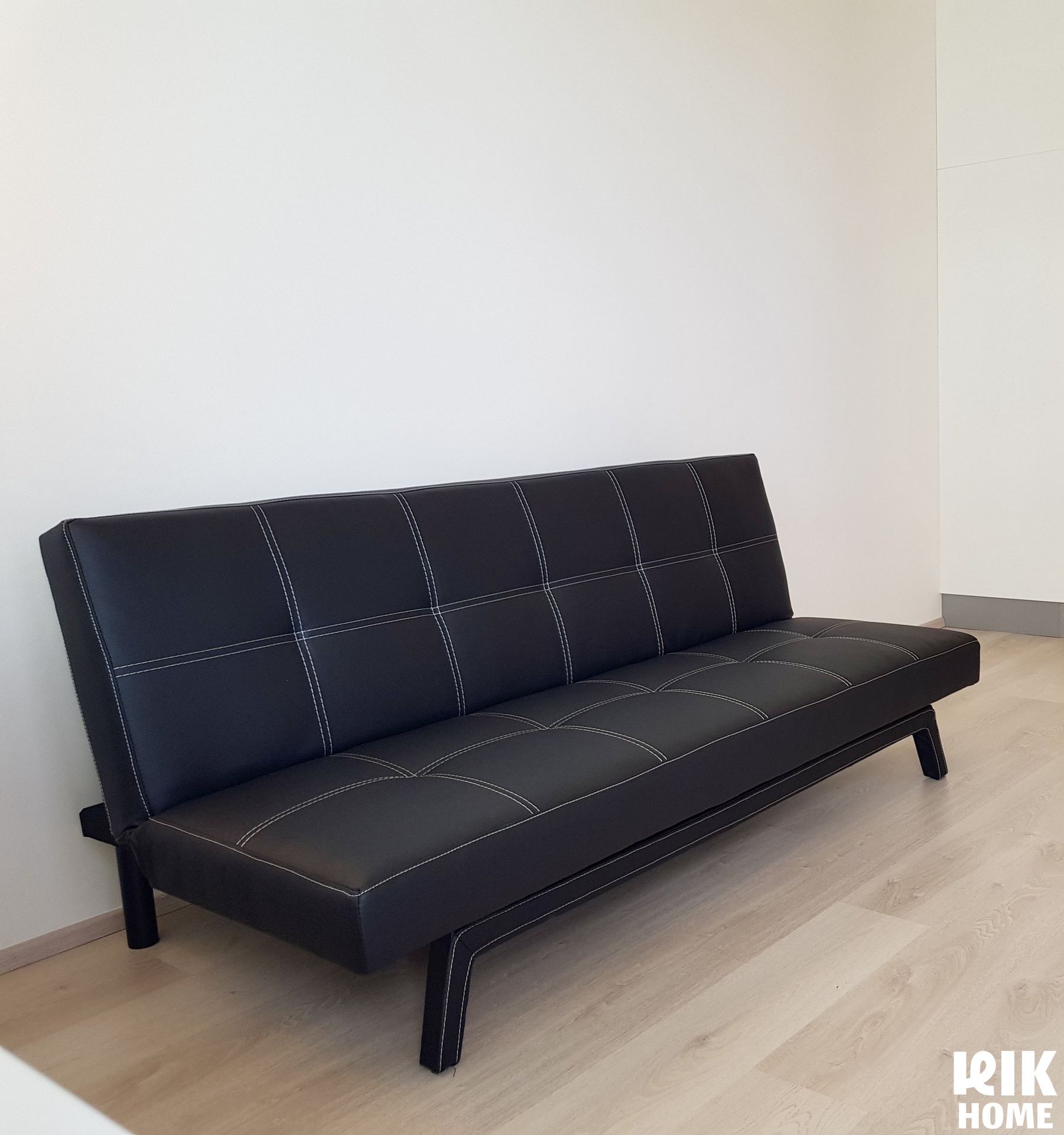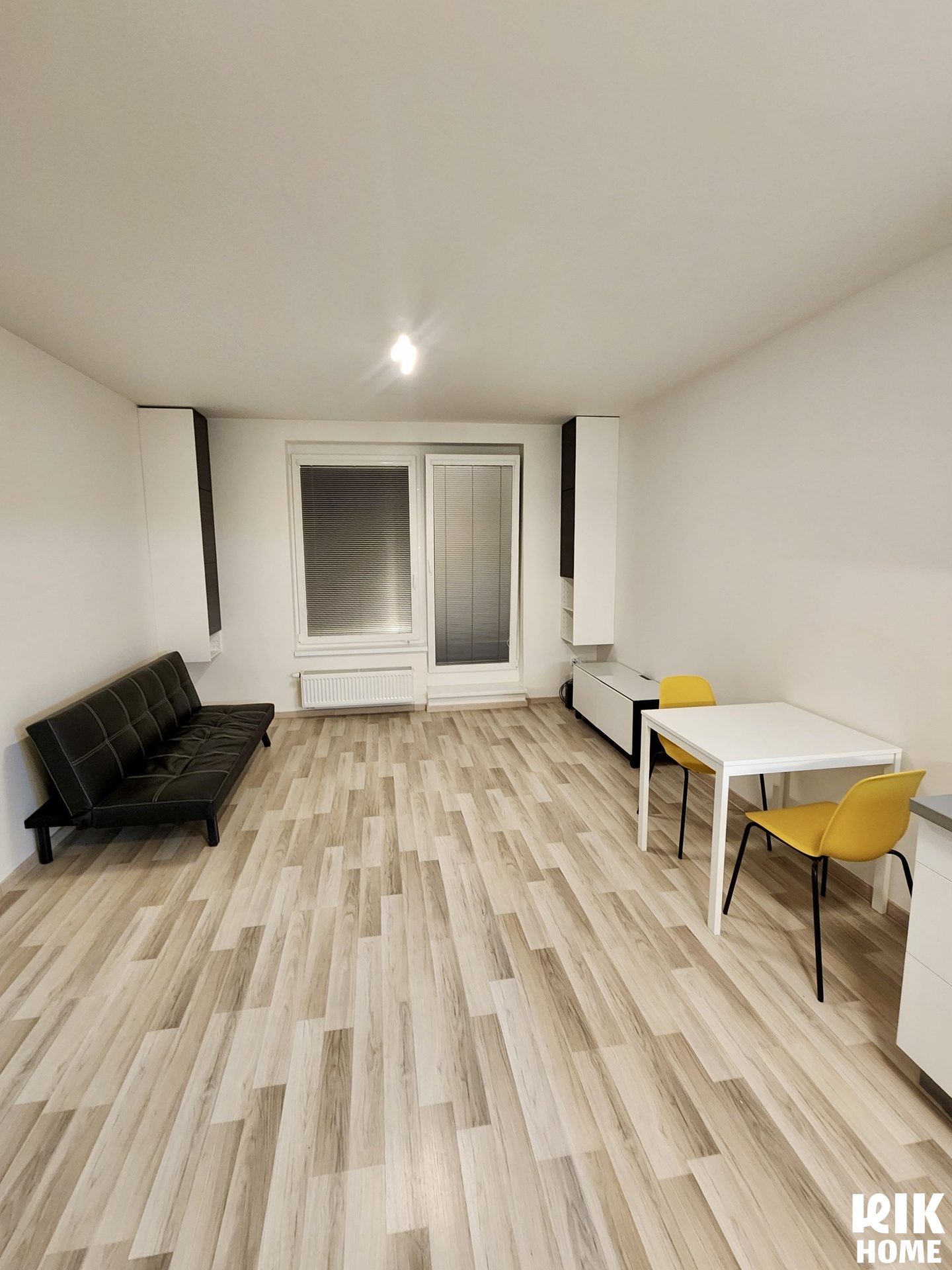 Obývací část: Jídelní stůl se dvěma židlemi, rozkládací černá pohovka, komoda pod TV a závěsné skříňky. Do bytu je možné dodat manželskou postel včetně lamel (bez matrace).