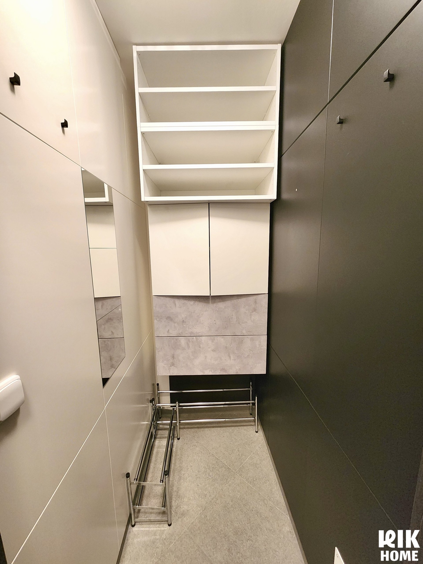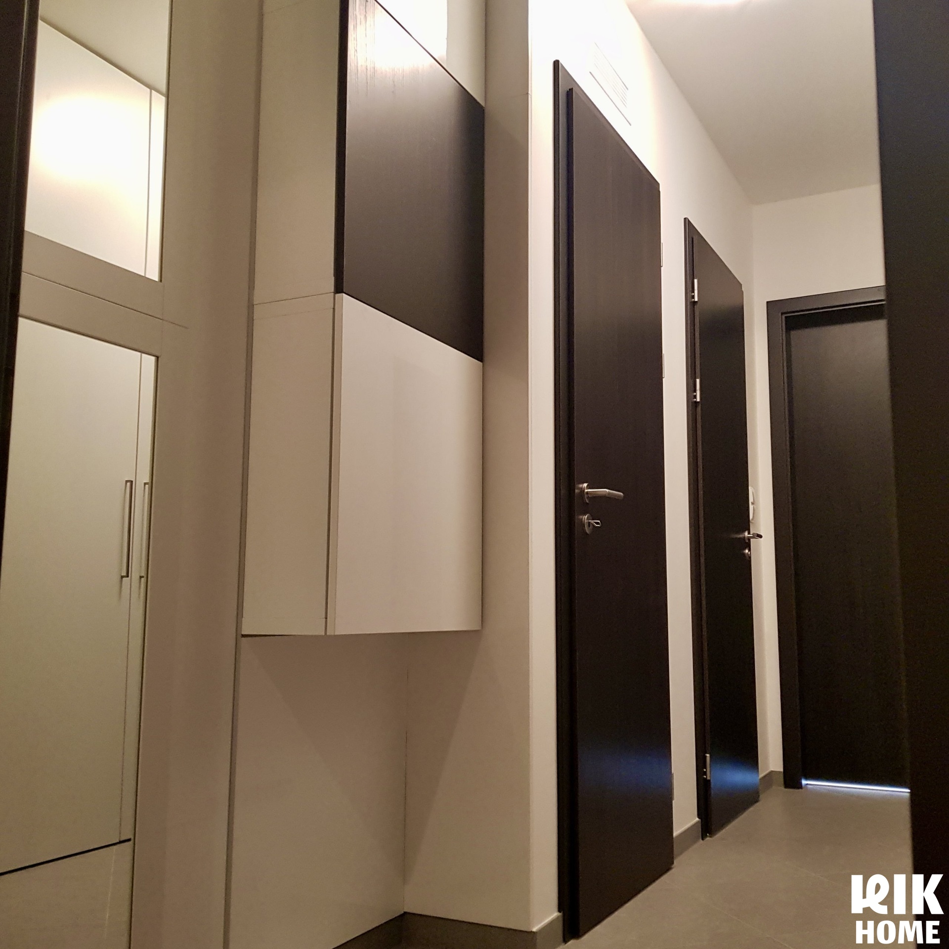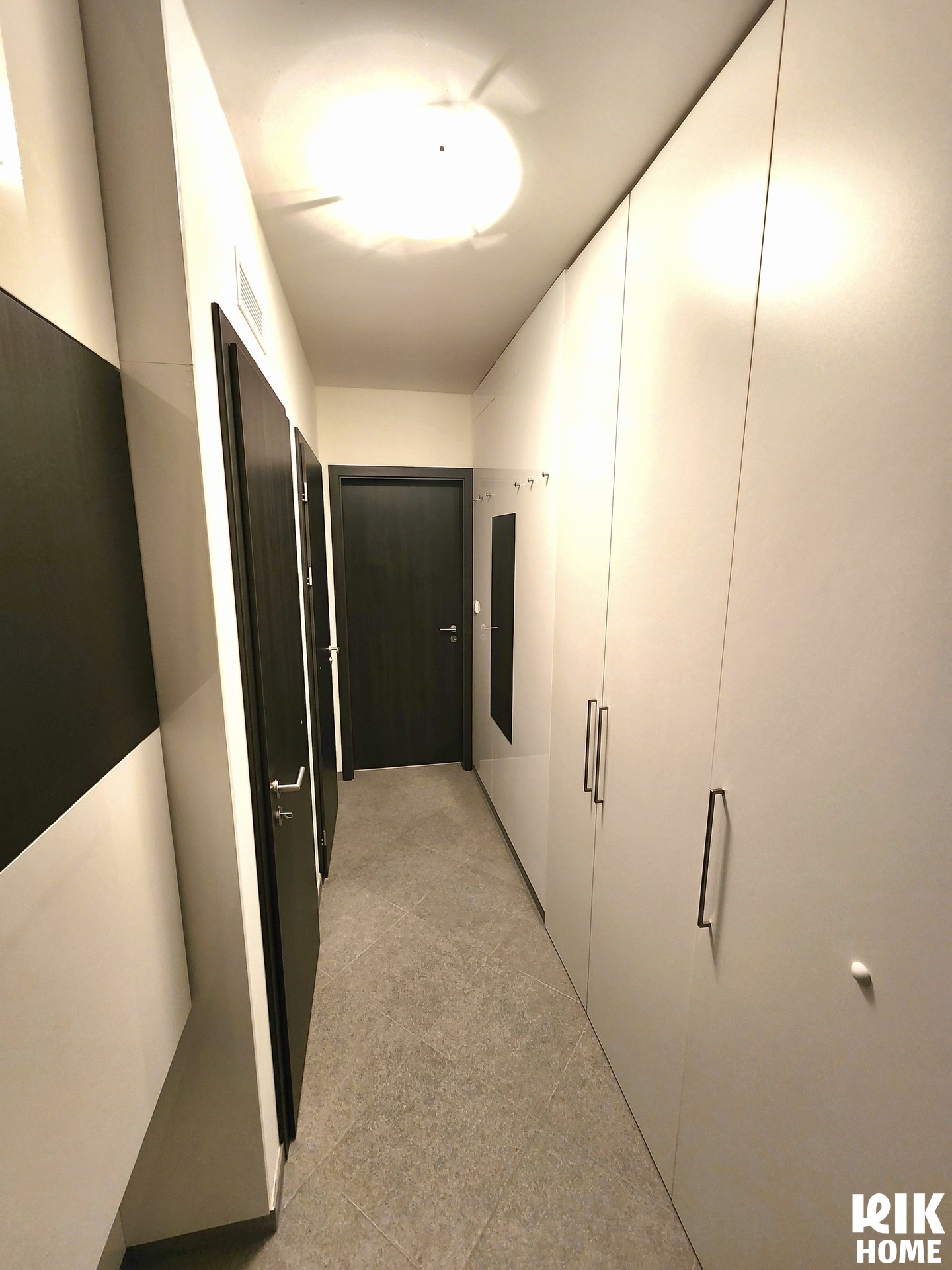 Předsíň: Velkorysý úložný prostor zajišťuje sestava vysokých vestavných šatních skříní až ke stropu, věšáková stěna a zrcadla.