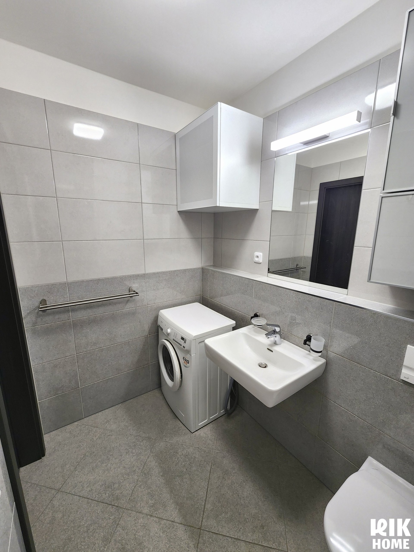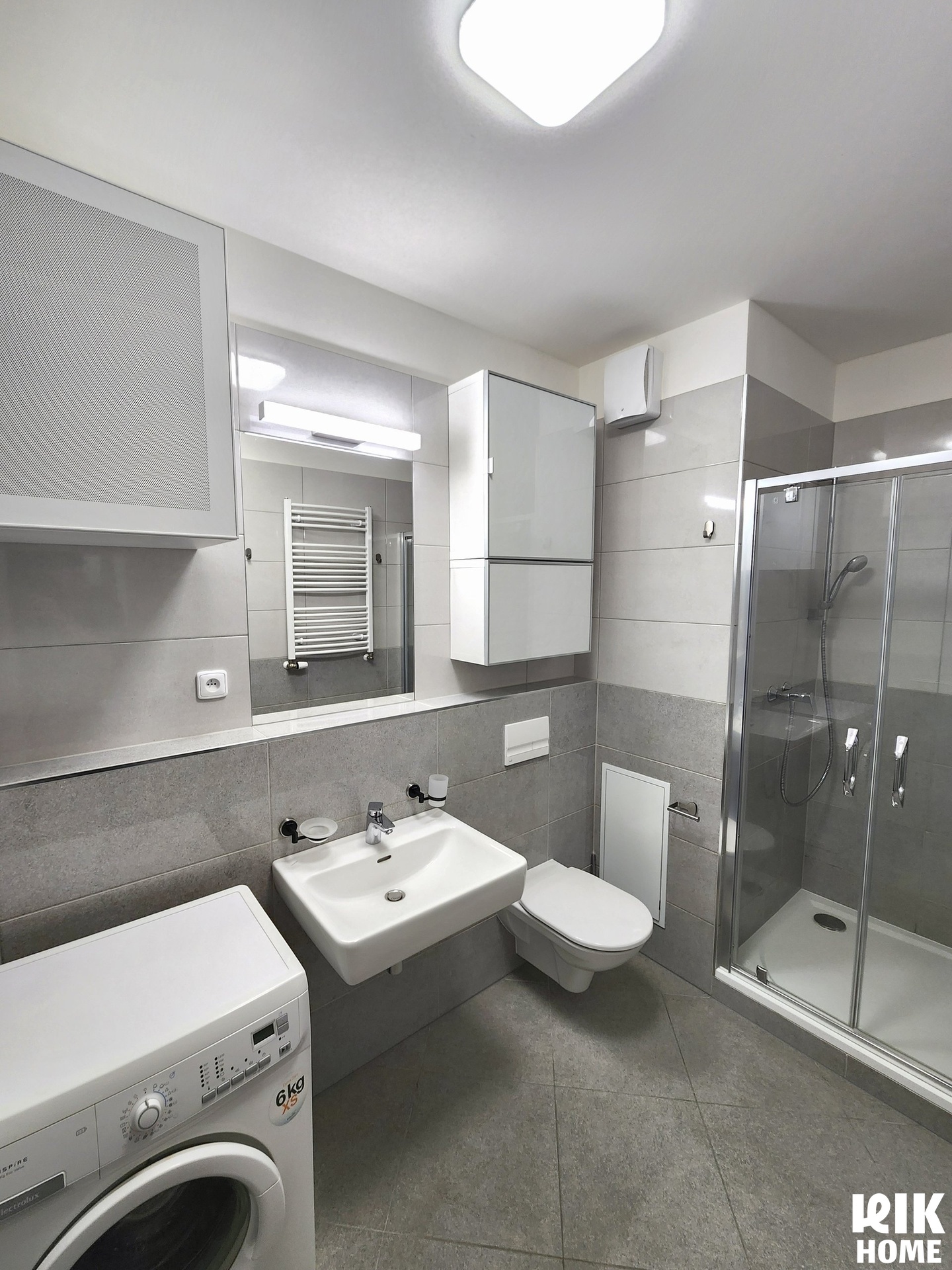 Koupelna: Vybavena sprchovým koutem, umyvadlem se zrcadlem, závěsným WC, úložnými skříňkami a pračkou.