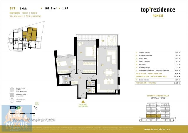 Nabízíme k dlouhodobému pronájmu prostorný a světlý byt 3+kk o podlahové ploše 102,3 m² v moderní novostavbě Top Rezidence Pomezí v ulici Lerausova, Praha 5 – Košíře.Byt je zcela nový a dosud v něm nikdo nebydlel. Nabízí tak možnost stát se vůbec prvním nájemcem.Byt se nachází v 1. nadzemním podlaží domu G4 a nabízí velmi praktické dispoziční řešení. Dominantou bytu je velkorysý obývací pokoj s kuchyňským koutem o výměře 36,8 m² se vstupem na prostorný balkon o velikosti 10,7 m² orientovaný na severovýchod. Díky velkým francouzským oknům je celý prostor krásně prosvětlený.Byt se skládá z ložnice o velikosti 24,2 m², druhý pokoj / pracovna 13,1 m², koupelna s vanou, samostatné WC, praktická komora přímo v bytě, prostorná vstupní chodba s dostatkem místa pro vestavěné skříně.Byt je vybaven ve vysokém standardu a disponuje moderním smart-home systémem. Samozřejmostí jsou dřevěné podlahy v obytných místnostech, kvalitní keramická dlažba v koupelně a na WC, velkoformátová okna a moderní kuchyňská linka se spotřebiči. Smart-home umožňuje pohodlné ovládání rekuperace vzduchu s funkcí ochlazení interiéru v letních měsících, inteligentního osvětlení, venkovních žaluzií i podlahového vytápění se senzory v jednotlivých místnostech. Díky tomu byt nabízí maximální komfort a nízké provozní náklady. K bytu náleží sklep a garážové stání v podzemních garážích domu.Rezidence nabízí klidné bydlení v zeleni s výbornou dostupností do centra Prahy. V bezprostředním okolí se nachází lesopark Vidoule, přírodní rezervace Cibulka a Prokopské údolí. V blízkosti jsou zastávky MHD, obchody, restaurace i veškerá občanská vybavenost.Měsíční poplatky spojené s užíváním bytu činí 8 302 Kč včetně záloh na služby a energie. Elektřina bude převedena na nájemce. Kauce ve výši 2 nájmů.Byt je ideální pro pár nebo rodinu, kteří hledají moderní a klidné bydlení v novostavbě s balkonem, parkováním a výbornou dostupností.