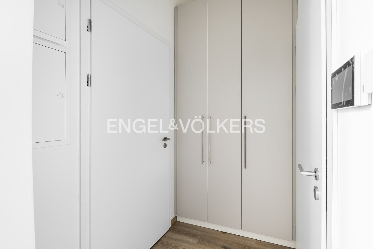 Dispozičně byt nabízí vstupní předsíň s praktickými vestavěnými skříněmi, ze které se vstupuje do prostorného obývacího pokoje s moderním kuchyňským koutem. Kuchyň je vybavena zcela novou linkou a kvalitními vestavěnými spotřebiči – elektrickou troubou, varnou deskou, lednicí s mrazákem a myčkou. Byt dále disponuje dvěma neprůchozími ložnicemi, z nichž každá je zařízena prostornou šatní skříní. Moderní koupelna je vybavena sprchovým koutem a toaletou.