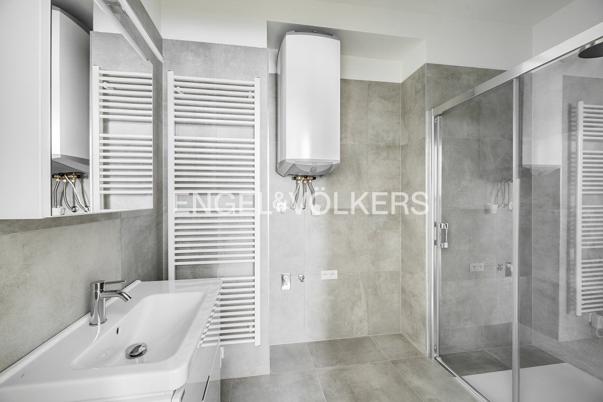 Koupelna s designovým zařízením a přípojkou na pračku