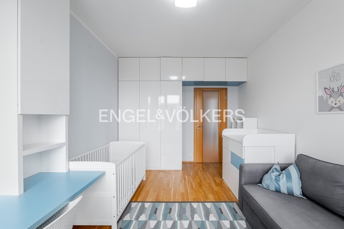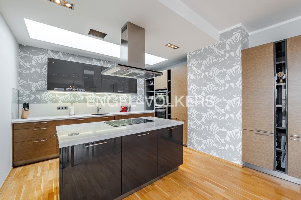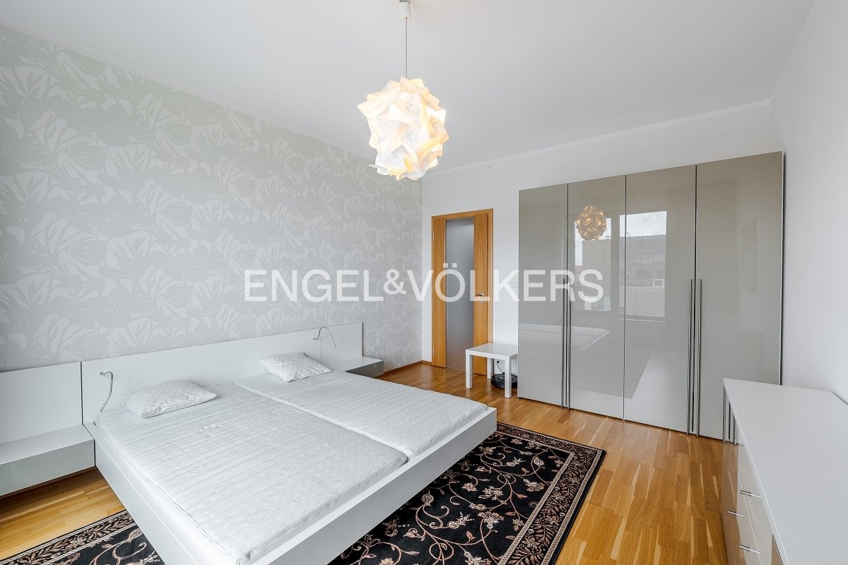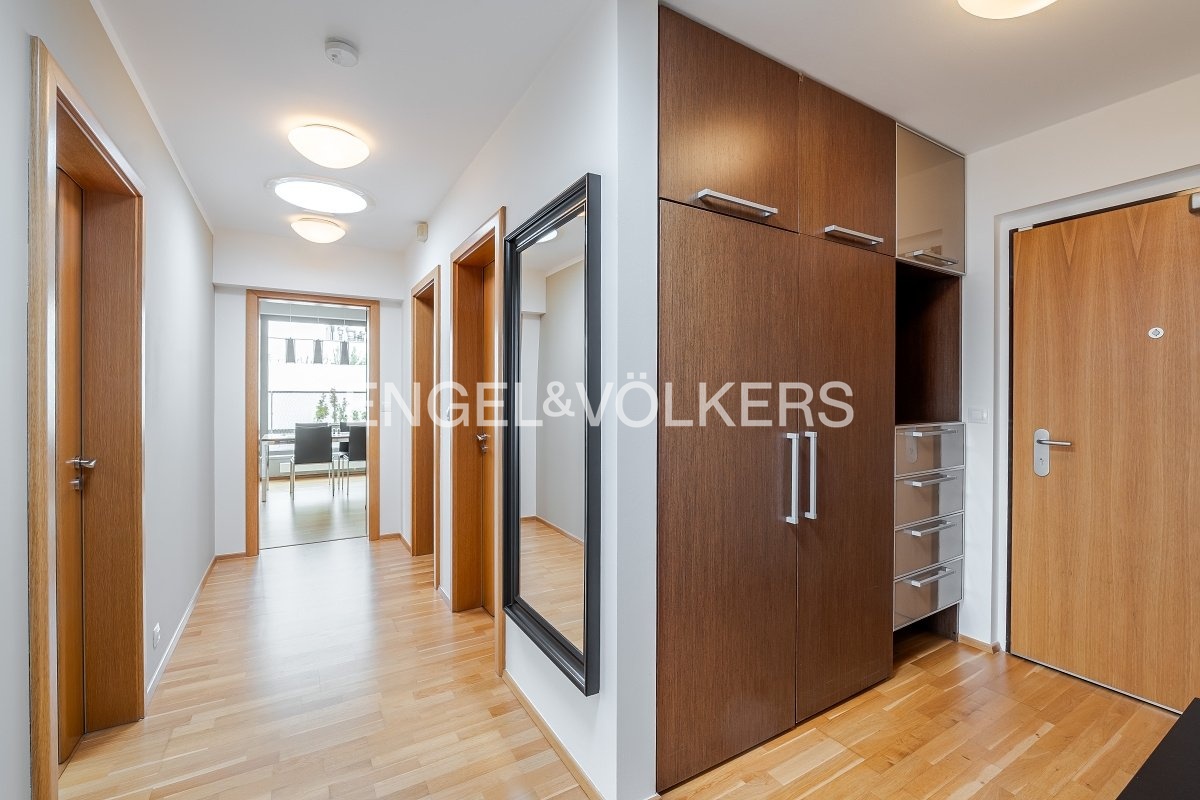 Dispozice bytu zahrnuje prostornou vstupní chodbu s vestavěnou šatnou. Chloubou bytu je obývací pokoj s terasou o rozloze 100 m2 orientovanou do klidného vnitrobloku. Obývací pokoj je propojený s kuchyňským koutem plně vybaveným všemi spotřebiči a ostrovem. Dvě samostatné ložnice jsou vybavené vestavěným nábytkem na míru a jsou příjemně světlé díky velkým francouzským oknům. Koupelna je vybavena sprchovým koutem a vanou, toaleta je odděleně.