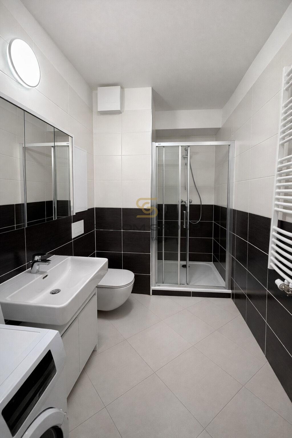 V koupelně sprchový kout, topný žebřík, toaleta a pračka. Dále interiérové dveře, plastová okna, vinylová podlaha a dlažba, nové rozvody vody, elektřiny a odpadů, protipožární vchodové dveře.