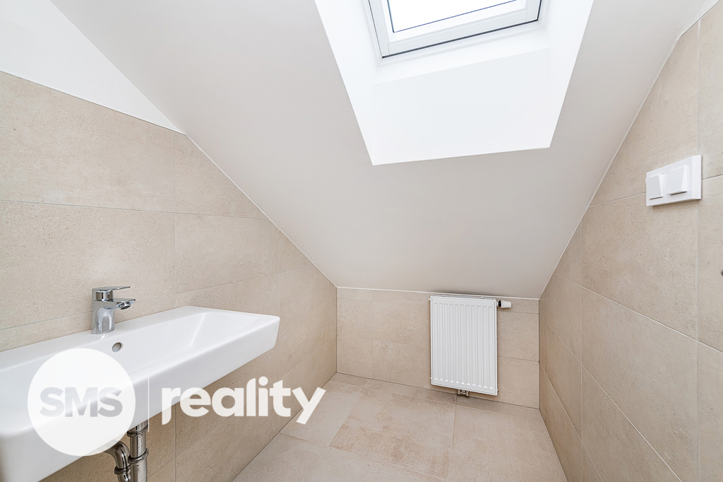 • Patro: místnost se skosenými stropy, neoddělená dveřmi od schodiště a vlastní druhou toaletou s umyvadlem.