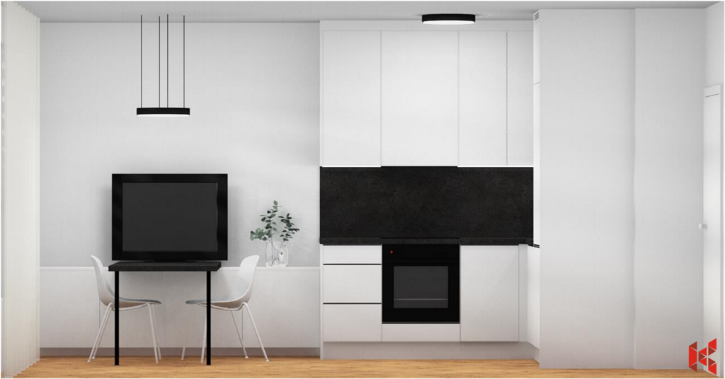Byt je vybaven vestavěným nábytkem a kompletní kuchyňskou linkou včetně spotřebičů: varná deska, trouba, myčka nádobí, lednice a odsavač par. Stačí přivézt osobní věci.