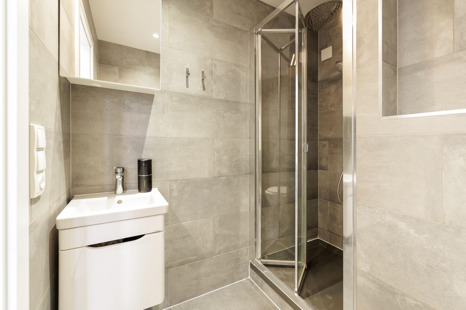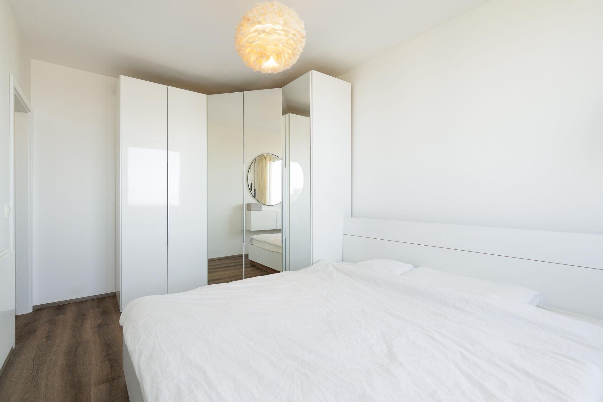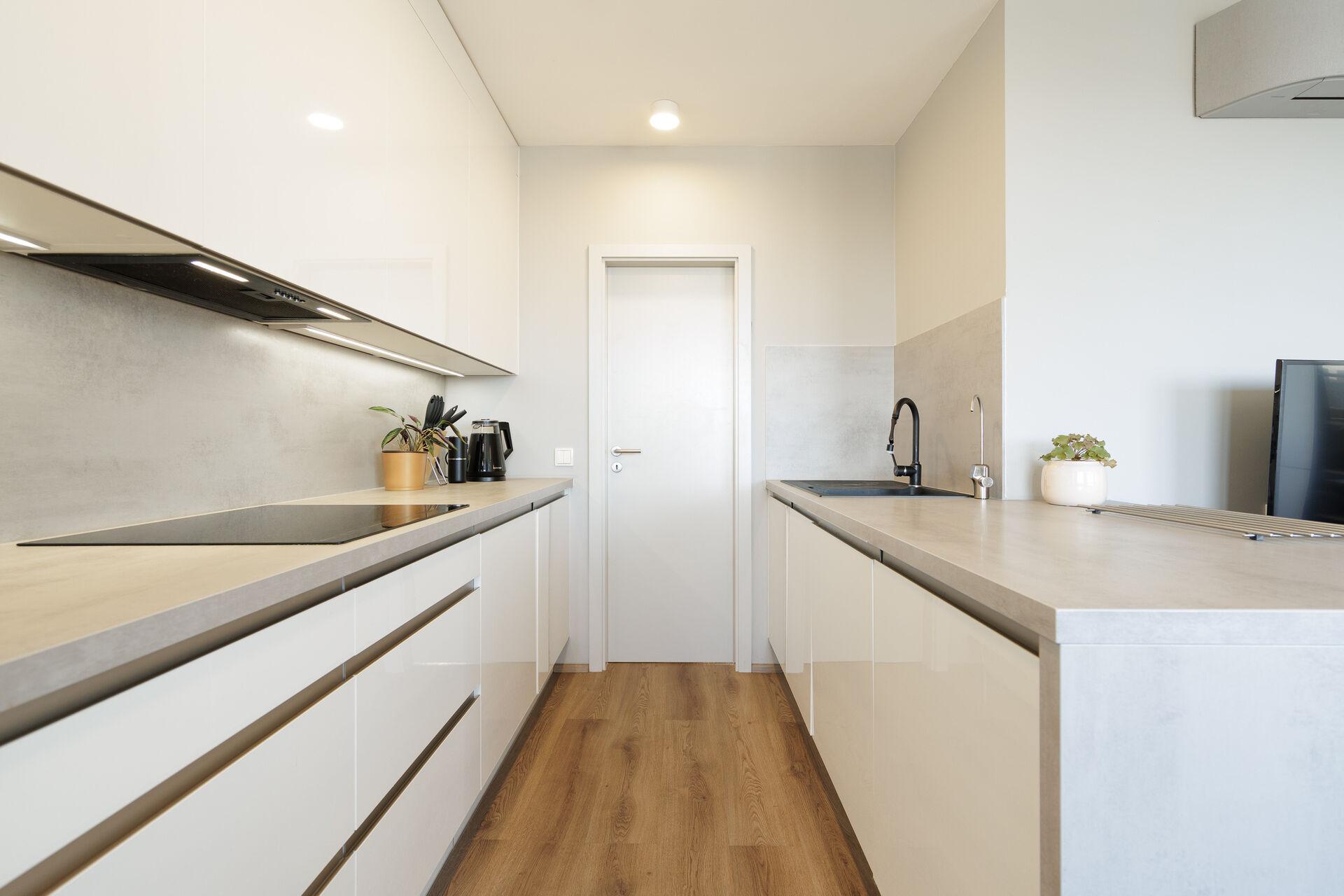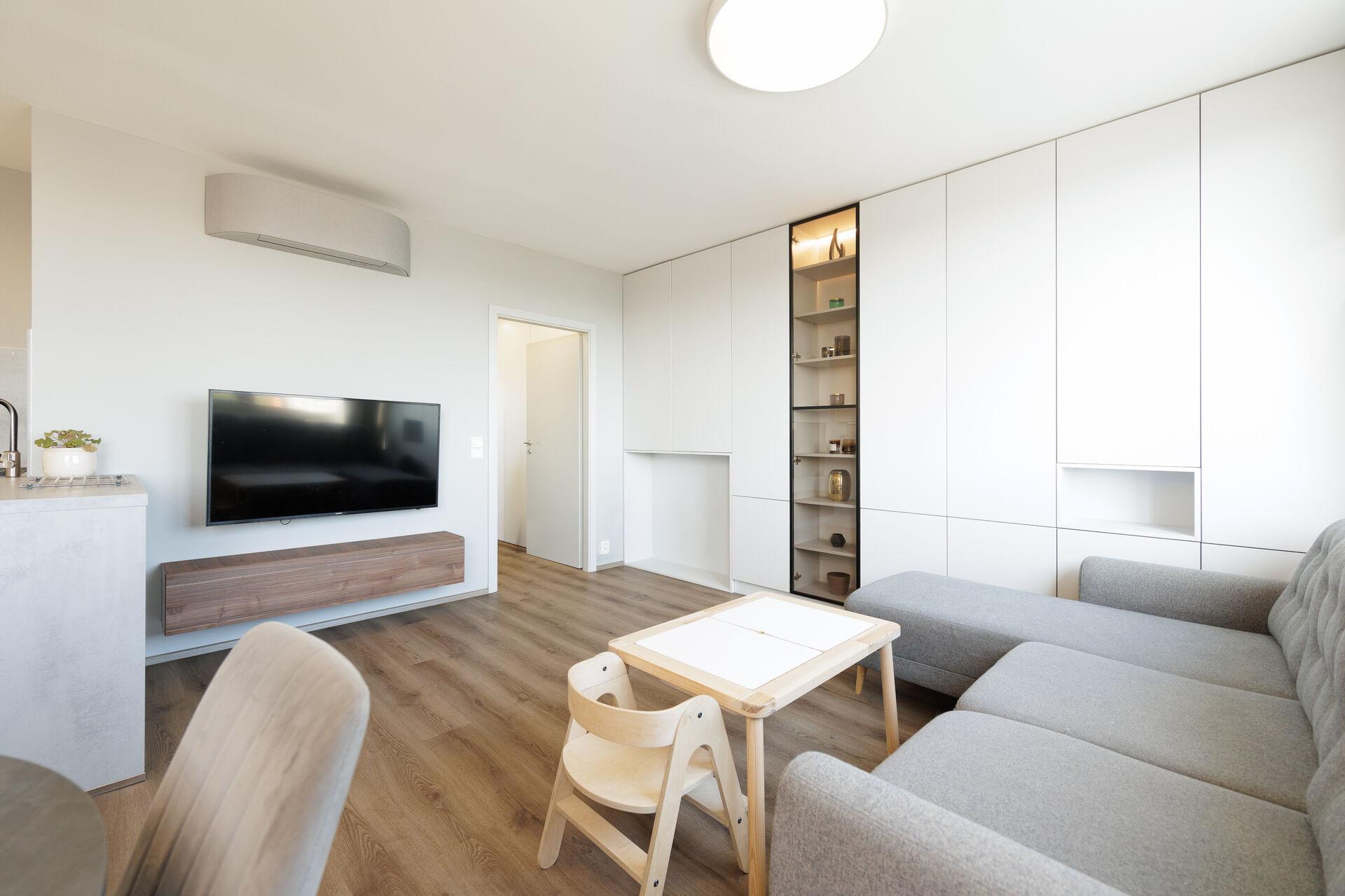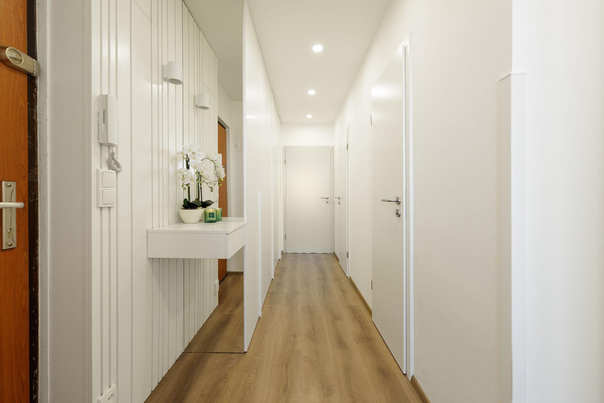 Byt nabízí vstupní halu s nábytkem na míru, následuje obývací pokoj s kuchyňským koutem a vstupem do pracovny. Z chodby se dále vstupuje do dětského pokoje a ložnice, také do obou koupelen.