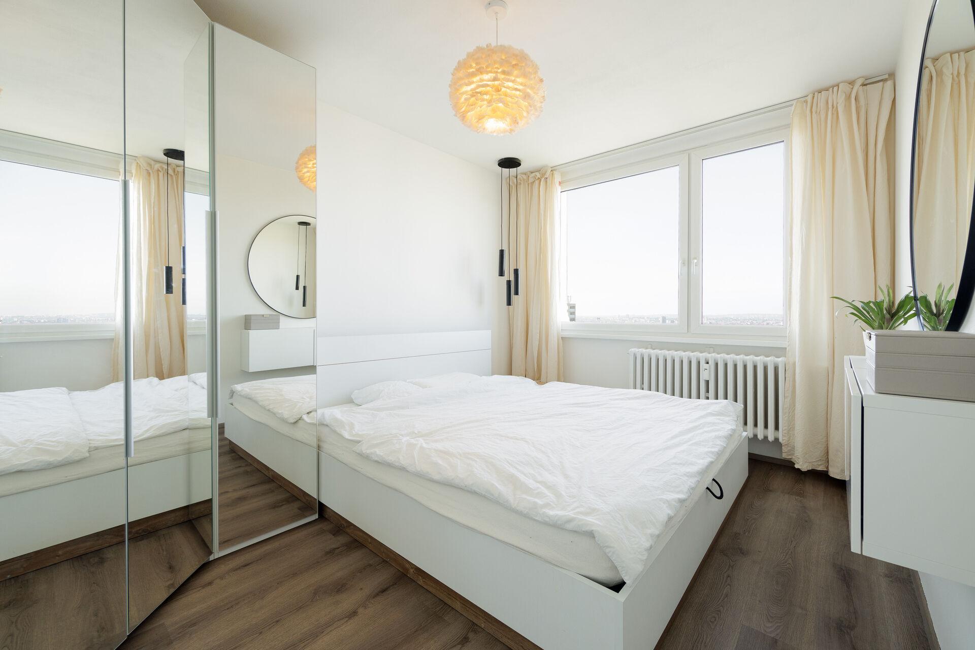 Nabízím k pronájmu plně vybavený světlý a prostorný byt o dispozici 4+kk a výměře 73m2 v posledním patře, který zaujme především nádherným panoramatickým výhledem na celou Prahu. Byt je orientován na tři světové strany – na sever (ložnice a pokoj), jih (obývací pokoj s kuchyní) a západ (pracovna), díky čemuž je krásně prosvětlený po celý den.