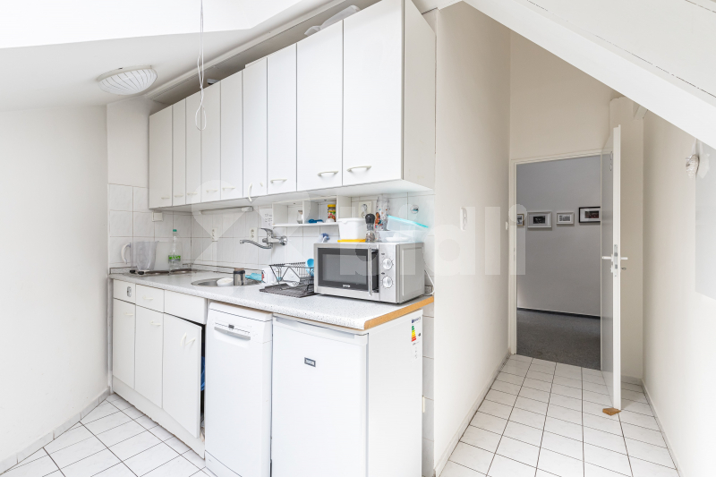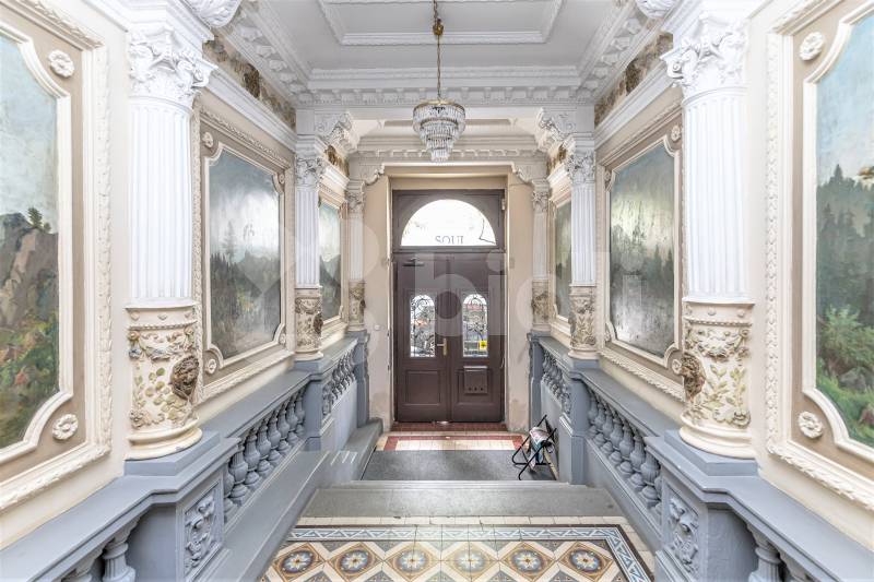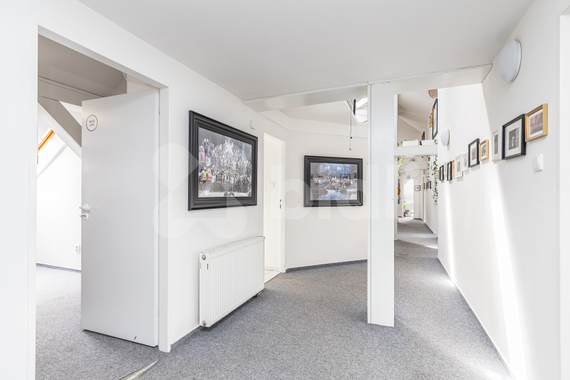 Ze schodiště vcházíme do centrální místnosti, která může sloužit jako recepce. Z ní vedou dveře do samostatné chodby s jednou kanceláří s kuchyňkou, skladem, WC a koupelnou s vanou (lze samostatně pronajmout), dále pak do místnosti, jež by mohla být využívána k pracovním schůzkám, jednáním, poradám (zde je i kuchyňka, WC a vyvýšené patro).
