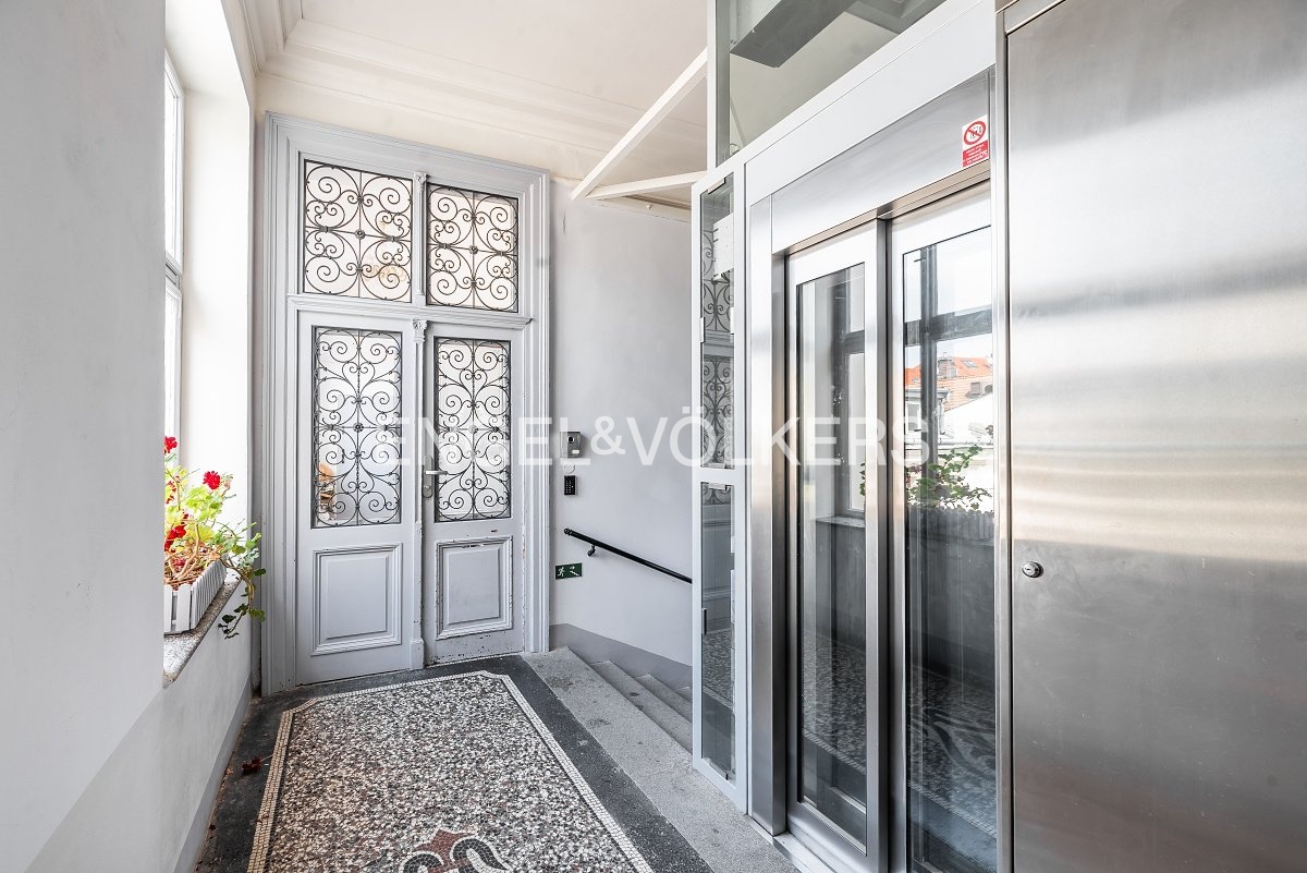 V činžovním domě je nově nainstalován výtah, který zajišťuje přístup až do předposledního patra.