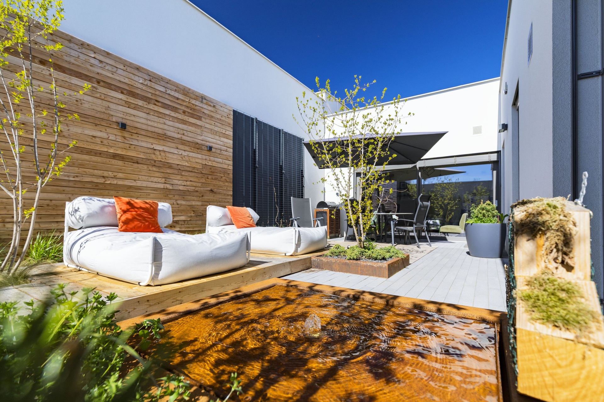 Nový jednopodlažní dům o dispozici 4+kk (127 m²) + 56 m² terasa + 11 m² venkovní sklad, vstupní portál 5 m² a dvě parkovací stání před domem.