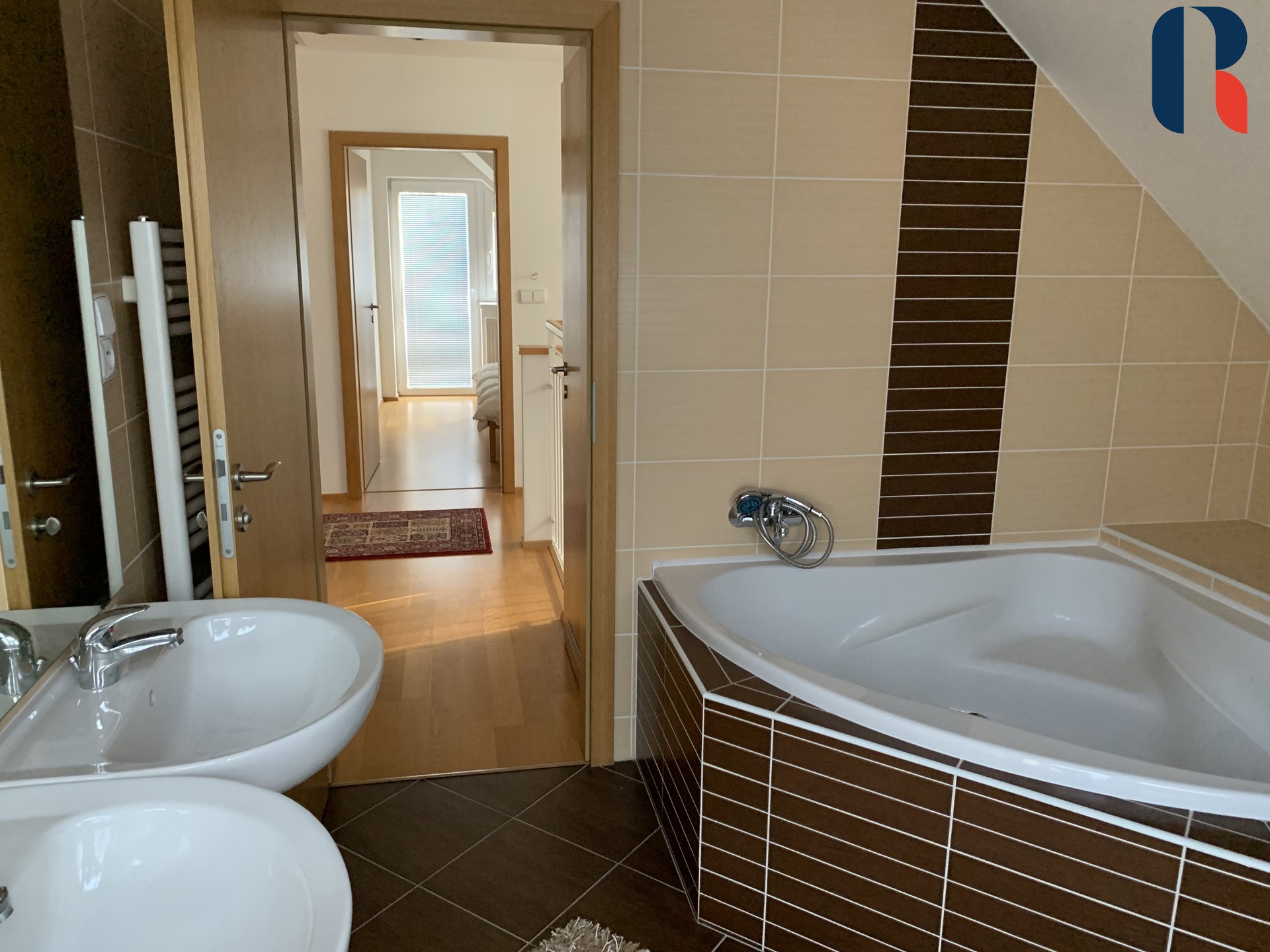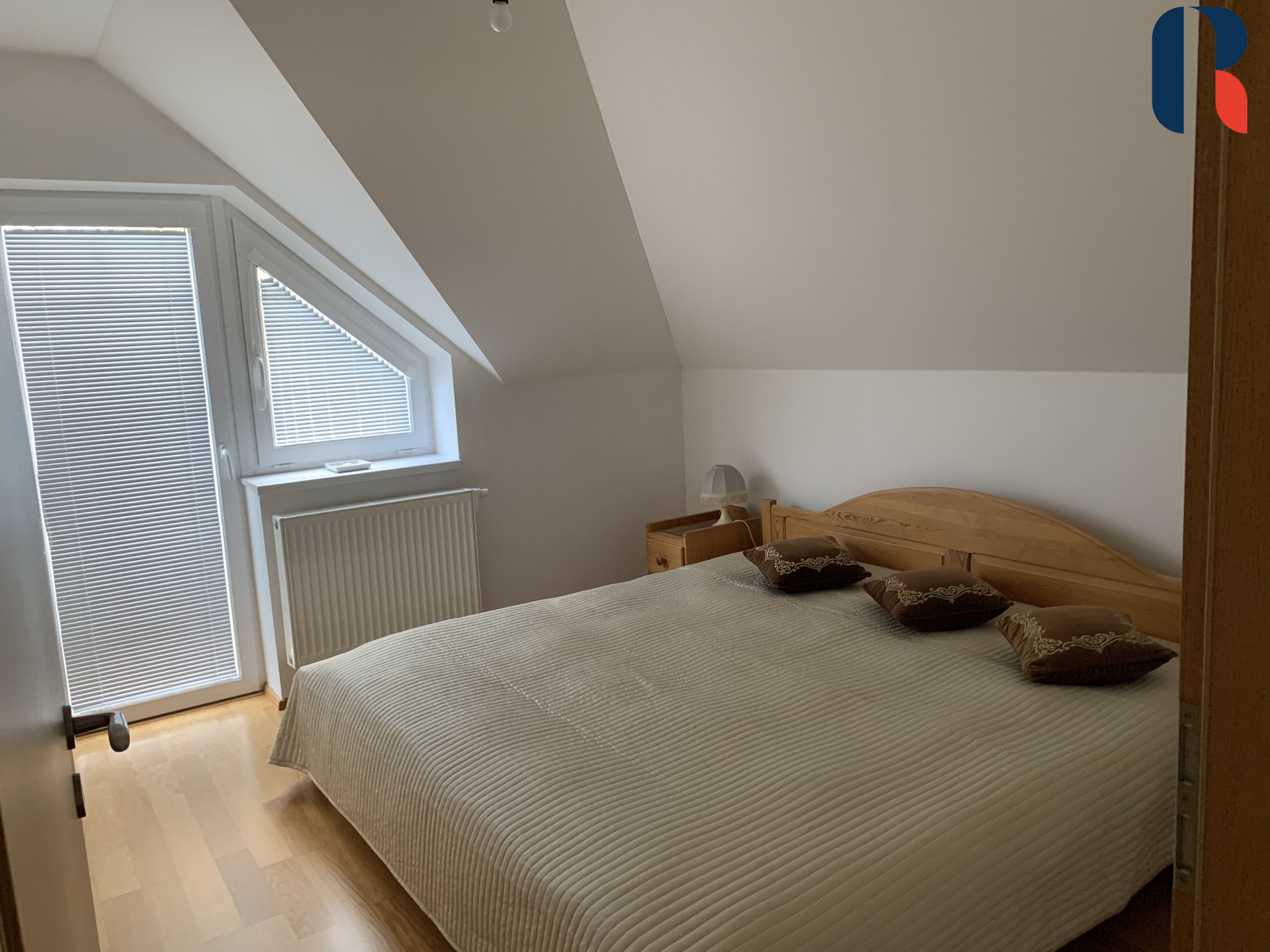 Ve druhém podlaží jsou tři neprůchozí pokoje (2x11 m2, 35 m2) , koupelna s vanou a spojující chodba, ze které je přístup na půdu (další úložný prostor).