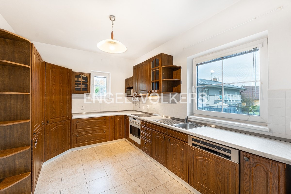 V přízemí najdete velký obývací pokoj s krbem a vstupem na terasu, samostatnou kuchyň, dva další pokoje, koupelnu s vanou i sprchovým koutem a oddělenou toaletu. V patře se nachází pět pokojů, druhá koupelna, pračka se sušičkou a samostatná toaleta. Díky množství oken a balkonů je dům velmi světlý a nabízí příjemné výhledy do okolní zeleně.