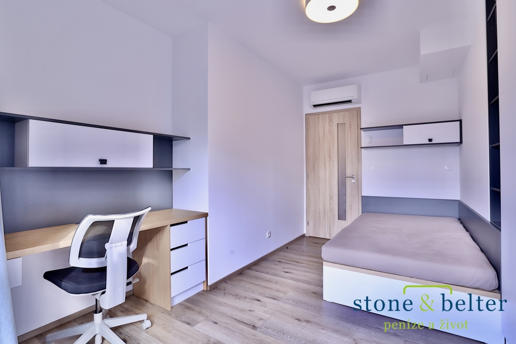 • v celém bytě je barevně sladěný nábytek na míru (vestavěné skříně, postele, psací stoly atd.)