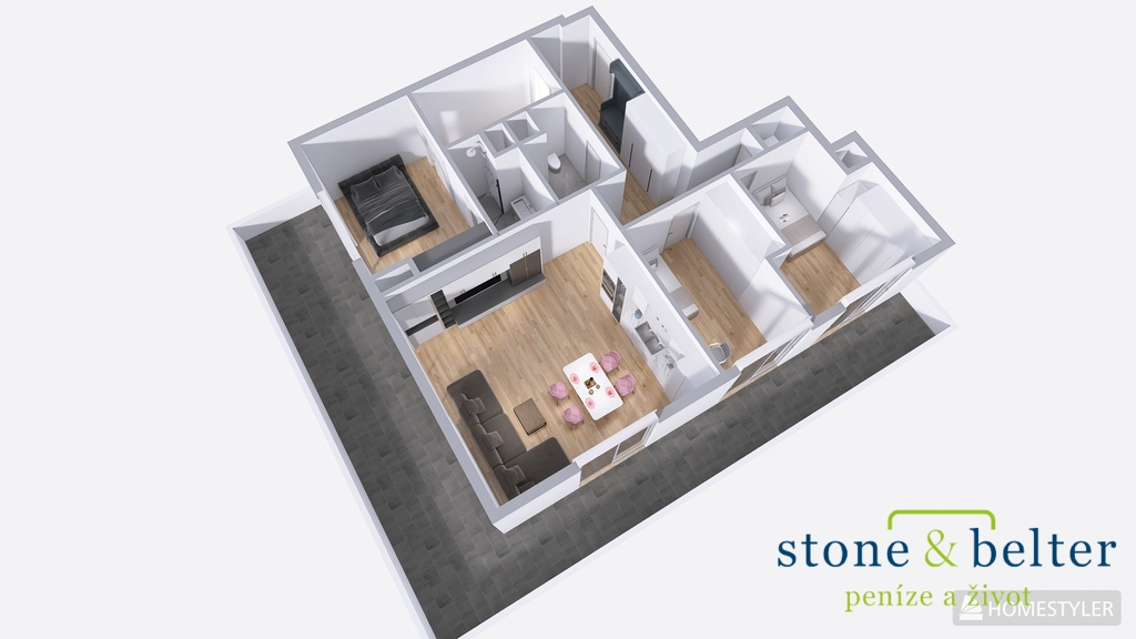 Byt se skládá z obývacího pokoje s kuchyňským koutem (33,1 m²), ložnice (15,1 m²), 2 pokojů (12,7 m² a 14,1 m²), 2 koupelen s toaletou (4,3 m² a 3,9 m²), technické místnosti pro pračku a sušičku (1 m²), vstupní chodby (13,6 m²) a chodby s úložným prostorem vedoucí k ložnici (6,8 m²). K bytu dále náleží sklep.